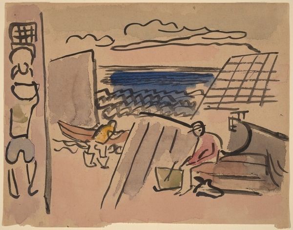 Editor: We're looking at Arthur Dove's "Along the Shore" from 1937, done with watercolor. It feels...deceptively simple, almost childlike, but there's a real sophistication in how the shapes are arranged. What strikes you most about this piece? Curator: It's precisely that tension between simplicity and sophistication that I find so compelling. Dove was working during a period of immense social upheaval, the tail end of the Great Depression, anxieties about looming war… How do you think this apparent simplicity might speak to those concerns? Editor: I hadn't really considered that. It's almost…an escape? A deliberate turning away from the chaos? Curator: Precisely. And let’s not forget the broader art world context. European modernism was largely focused on urban experience. Dove, by focusing on the American landscape, specifically rural and coastal scenes, offered an alternative vision of national identity. How does that impact its message? Editor: So it's making a statement just by depicting what it does? Like it is reaffirming core values or providing contrast with European values? Curator: Exactly. The work’s materiality also carries weight, beyond just the subject it represents.. Why watercolor? Think about the associations – intimacy, fragility, the everyday. How does that change its overall impact, when compared to a grand oil painting for example? Editor: It feels less imposing. More approachable. I think I get what you mean by its social commentary. This quiet, unassuming landscape carries a radical message of resilience and a subtle political counter-narrative. It’s powerful because it *doesn’t* shout. Curator: Exactly. That subtle power allows viewers to actively engage and build our own understanding of that American Identity Dove hints at.