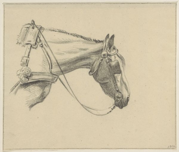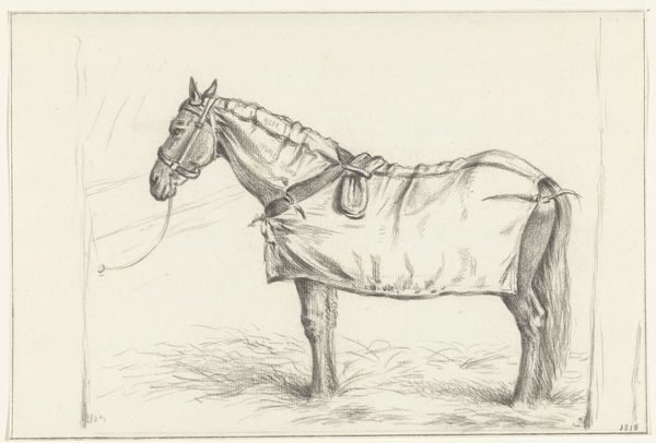 Jean Bernard made this drawing of a standing harnessed horse facing left with pen in gray ink, sometime before 1833. This simple sketch allows us to consider the changing relationships between humans and animals in the 18th and 19th centuries. The image captures a moment of stillness, but implies the potential for movement and labor. We can imagine the horse as a critical component in the infrastructure of the Netherlands. The economic structures of the time relied heavily on animal power for agriculture, transportation, and industry. What do the horse's physical form and harnessing tell us about its social role? To understand this drawing better, we might consult agricultural records, transportation studies, and social histories of the period. These resources help us to interpret its meaning as something contingent on its particular social and institutional context.