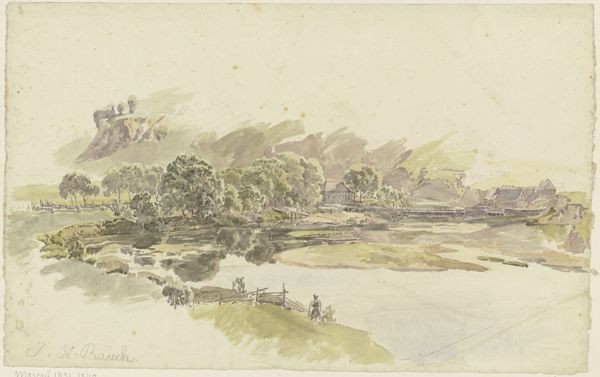 Editor: Antoine Chintreuil's "Extensive landscape prospect with a fortified building on hill in the background," likely made with watercolor, has this dreamy quality to it, almost like a faded photograph. What jumps out at you when you see it? Curator: Well, it is definitely beautiful but what strikes me is its relation to production, right? This isn't just a pretty picture, it shows someone directly interacting with and representing their material conditions. The plei-air process speaks of working with the immediacy of available materials, light, and air. How do you see the labor inherent in the making? Editor: That’s an interesting point! I guess I hadn't really considered the act of its creation. Knowing that it was done outside, 'en plein air,' brings a new appreciation for the artist's process, setting up their tools to capture the image directly from the land. Curator: Exactly. Think of the artist choosing, carrying, mixing and applying these watercolors. Consider their interaction with the paper and the elements. This image, while romantic, is rooted in tangible work, not just idealized beauty. It bridges the gap between what is high art and working landscape and cityscapes. Do you think it challenges established power structures? Editor: In a way, yes. By valuing the immediate, material reality, like plein-air drawings or prints, isn't Chintreuil subtly resisting the formal constraints of the traditional art world? It feels like democratizing art a bit, moving away from academic perfection and celebrating process. Curator: Precisely! And through the artist's labour he offers an alternative form of both landscape and social analysis, turning materials to an artwork rooted in his own world. Editor: I’ve definitely got a fresh take away, knowing more of materiality to Chintreuil's process helps reveal the meaning embedded in this landscape, and a whole lot more of material realities to landscape works in general. Thanks!