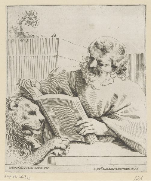 Giovanni Battista Pasqualini created this print of 'Lucas de evangelist' sometime in the early 17th century. During this period, art was deeply intertwined with the Catholic Church, and Pasqualini, like many artists, found patronage and purpose in religious subjects. Here, we see Luke the Evangelist, traditionally considered the author of the third Gospel and the Book of Acts, accompanied by his symbolic animal, the ox. What does it mean to depict a religious figure in such an intimate, almost domestic setting? Luke is not presented as a divine figure but as a scholar, deeply absorbed in his text. The ox, a symbol of sacrifice and service, rests its head affectionately against Luke's arm, creating a sense of companionship and mutual respect. This image reflects not only religious devotion but also the values of the time, emphasizing the importance of knowledge, contemplation, and the gentle power of faith. It invites us to reflect on the human side of religious figures and the profound connection between humanity, spirituality, and the natural world.