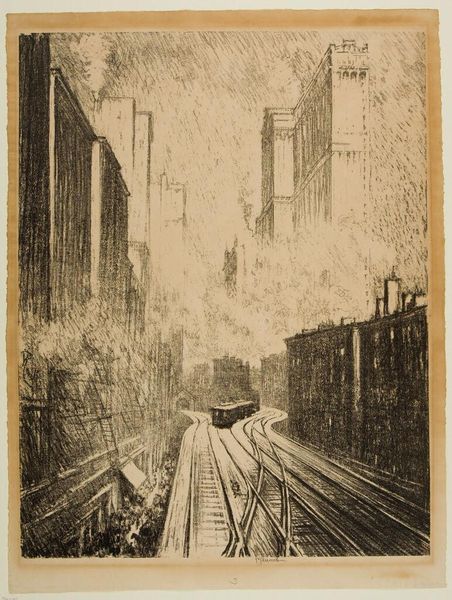 Editor: This is Joseph Pennell's "Great Gate, Charleroi," an etching, with no set date. It feels oppressive, all those looming structures rendered in such stark blacks and whites. What strikes you most about it? Curator: Oppressive is a good word! For me, it's the gateway itself, a dark void framing a vision of industry. Pennell seems both fascinated and a little frightened by this new industrial landscape. There's a real tension between beauty and something almost sinister. Editor: I see that tension. It’s like he’s saying, “Look at this powerful, but dangerous thing we’ve created." Curator: Exactly! And the etching technique only amplifies that, right? The starkness, the almost scratchy feel... It adds to the unease. Editor: I never thought about it that way, but it's like the medium itself is contributing to the message. Thanks! Curator: My pleasure! It’s funny how art can sneak up on you like that, isn't it?