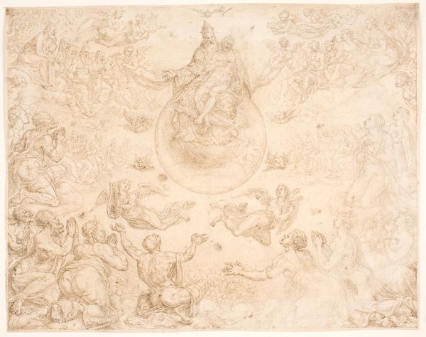 Francesco de Mura rendered this design for a ceiling with pen and brown ink in eighteenth-century Italy. It depicts Kings, Bishops, and Popes floating on clouds. This drawing acts as a window into the religious and political climate of the time. The figures, identifiable by their attire and symbols of power, suggest a divinely ordained hierarchy. De Mura worked during a period when the Catholic Church still wielded significant influence over Italian society and politics. This composition, in which church authorities occupy the highest position, likely reflects the conservative values of his patrons and their belief in established hierarchies. To understand this work, historians might study the history of the Catholic Church in Southern Italy, the patronage system that shaped artistic production, and the socio-political role of art in reinforcing power structures. Art like this reminds us of the complex interplay between artistic expression and social context.