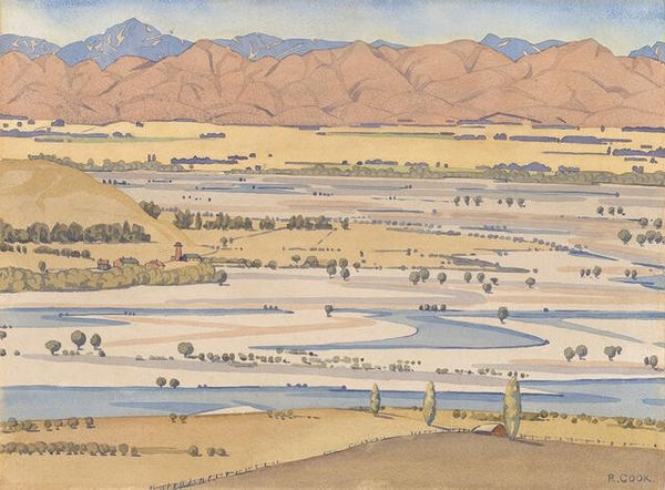 Editor: We’re looking at Rita Angus’s “Akaroa Hills,” created in 1943. It's a watercolor painting, and there’s something almost topographical about the way the landscape is mapped out. What stands out to you in this piece? Curator: It’s interesting you mention the topographical aspect. For me, the painting speaks to a very specific moment in New Zealand's cultural history. Consider 1943: wartime, a burgeoning national identity…Angus’s choice to depict the land, not just as scenery but as a vital component of nationhood, feels deliberate. The lines almost carve the landscape and invite an assessment of use and occupation. Don't you think? Editor: Absolutely! It's not just pretty scenery, is it? You can almost feel the weight of history in those hills, especially knowing it was painted during wartime. Was landscape a popular theme for artists then? Curator: It was, but the *way* Angus portrays it sets her apart. Unlike romanticized, idealized landscapes, this feels grounded in reality. There’s an almost austere quality, don’t you think? Also, consider the context of land rights and indigenous representation, it certainly invites discussion around the social and political dimensions in art production. Editor: That makes me rethink the somewhat muted palette. I initially saw it as simply realistic, but now I see a political charge and identity. Thanks, I hadn’t really connected those elements before. Curator: Art and its interpretations are often interconnected with evolving socio-cultural conversations. Editor: I'll definitely remember that while thinking about art in context.