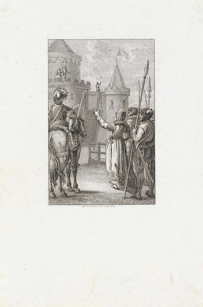 Editor: So this etching, "Theodorus on a Donkey Surrounded by Bishops and Monks," made in 1804 by Reinier Vinkeles, has such a detailed, historical feel. The composition looks…odd. What do you make of it? Curator: This image teems with encoded meanings. The choice of a donkey, for instance, isn't accidental. Donkeys often symbolize humility, perhaps even a conscious rejection of worldly pride for Theodorus. Yet, consider the historical context - what would riding a donkey *mean* to an audience familiar with biblical stories of Christ's entry into Jerusalem? Editor: A parallel, maybe? A deliberate echo of something grander? Curator: Precisely. And note how Vinkeles surrounds Theodorus with clergymen, yet emphasizes the encounter with a single monk on foot. The transfer of something – perhaps a document or relic – taking place? This could represent a specific moment of succession or delegation of power, steeped in symbolic importance within the religious order. What emotions do *you* gather from this scene? Editor: Well, I see respect, definitely a ritual. The way everyone is arranged gives it a formal, staged vibe, but there’s something also very earthy about that donkey... it is quite the juxtaposition. Curator: Yes, a brilliant discordance. Earthy humility elevated into solemn ritual. Consider how the artist weaves together these threads: the sacred space indicated by the gothic architecture in the background with a man of power riding a donkey! Now *that's* a visual metaphor! What’s your final reflection about it? Editor: I definitely didn’t expect so much meaning to be embedded in just one image. Seeing it just as a historical record would have been selling it short. Curator: Absolutely. Visual symbols are powerful cultural echoes. We interpret them, we reinterpret them, and, in doing so, perpetuate their significance across time.