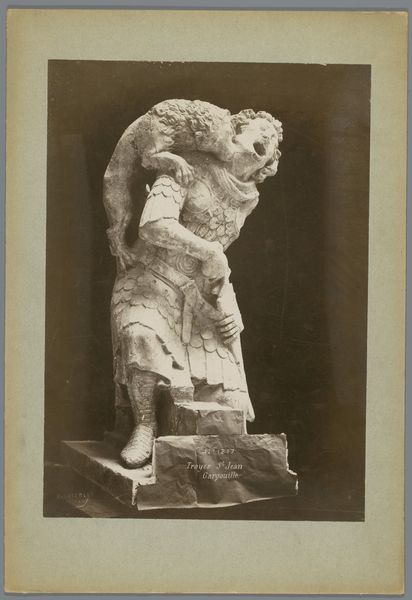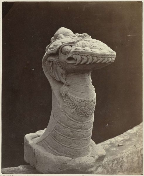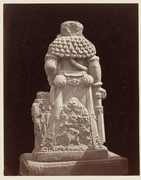 Curator: Look at the commanding presence of this work. Isidore Kinsbergen captured "Djokjokarta (Klaring) (r. Djokjokarta) Eight-armed bronze Trailokyavijaya dashing a corpse," likely between 1865 and 1867. What strikes you first about it? Editor: The sheer physicality. I’m immediately drawn to the textures and the way light plays on the bronze. You can almost feel the weight of the material. Curator: The materiality speaks volumes. This bronze sculpture, dating back to 9th-10th century Yogyakarta, becomes accessible to a new audience via Kinsbergen's photograph, a cultural and technological shift shaping the artwork’s reception. The photo allows us to witness the artistry beyond its immediate locale. Editor: Precisely! And it's not just about witnessing, but about participating in the consumption and understanding of the artwork through the photograph itself. We see a powerful, multi-limbed figure, Trailokyavijaya, trampling a corpse – potent symbolism captured via a chemical process that’s also a commercial product. Curator: This image reveals a great deal about the institutional framing of Asian art within the colonial context. Kinsbergen, working in Java, was undoubtedly influenced by the prevalent European views. He created this image both for documentation, to catalog this Javanese cultural object, and likely for distribution. Editor: Exactly. Look at the setting - the dark backdrop isolates the figure. Kinsbergen’s process renders this complex deity into a studio object and highlights how the gallery setting would significantly alter one’s engagement. Curator: It’s fascinating to consider the choices involved: the angle, the lighting, the very act of isolating the sculpture. These factors actively shape how the Western gaze interprets it. Was this a straightforward portrayal, or were colonial ideas about the ‘exotic’ subtly baked in? Editor: I find myself considering the labor involved – not just the artistry of the original bronze casting, but also Kinsbergen’s labor, the work of producing prints and distributing them, creating a market and visual language around the “oriental” artifact. Curator: Understanding how institutions presented art shapes how people perceived cultures outside their own. This photo participates in those dialogues and creates entirely new contexts that outlive the depicted work of art. Editor: Indeed, seeing this image is really about untangling layers of material, process, social, and institutional relationships—illuminating power dynamics that influence the production, consumption, and enduring legacy of a cultural artifact.