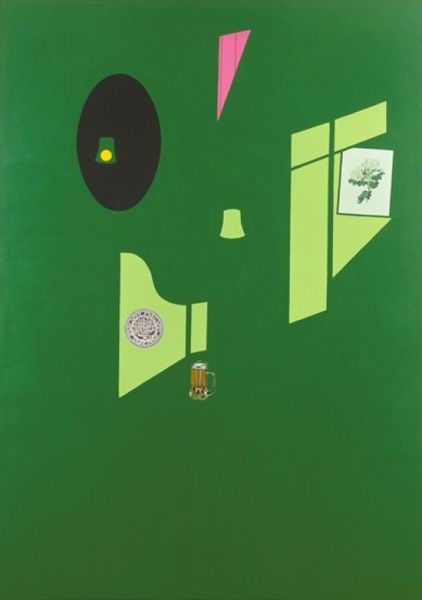 Curator: Standing before us is Patrick Caulfield's “Hemingway Never Ate Here,” a painting from 1999. Editor: My first impression is that it feels austere, almost stage-like, with that flattened perspective. There's a distinct contrast between the hard edges and that dark, rather imposing bull's head mounted on the wall. Curator: Caulfield's art often engages with this tension between the ordinary and the symbolic. That bull's head is intriguing, as bulls appear as recurring motifs across cultures representing power and virility, here oddly juxtaposed within what seems like a simplified interior. Do you sense an intended irony? Editor: Perhaps. Caulfield was clearly fascinated with the material culture of everyday life, but he deconstructed it, didn’t he? The acrylic paint, thinly applied, allows those blocks of color to remain independent, denying any illusionism. Look how the table and items are rendered in a much more conventional style to really amplify the modern abstraction nearby. It questions notions of value—challenging the preciousness often associated with painting. Curator: Precisely. Even the title pulls us in, "Hemingway Never Ate Here." Why this denial? The painting is a dialogue between what is represented, and the symbolic weight these images carry over time. The bull’s head itself evokes literary bravado, and a sense of existential dread, against the mundane implication of the room itself. Editor: And those dark shadows hint at how restaurants are places for both intimate and transactional exchanges. Caulfield draws our attention to the construction of these kinds of constructed environments, and our interactions with objects within them. Curator: The formal elements underscore the themes as you mentioned, from the choice of hues, the bold yellow against that forest green, as though a signifier of memory in art deco colors! This combination feels both inviting and unsettling. Editor: Caulfield offers not a solid depiction, but an interplay. What Hemingway did or did not do becomes secondary to Caulfield's manipulation of materials, space, and symbols. Curator: Ultimately, Caulfield's painting challenges our interpretation to reveal the layers within an otherwise familiar experience of time and place, by presenting a stage to perform these meditations. Editor: Yes. This is more than meets the eye on this minimalist rendering. A powerful commentary on experience and meaning in modern life, as distilled through its artful fabrication.