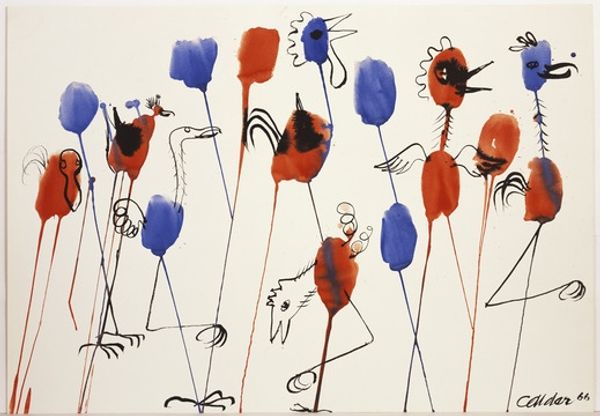 Editor: Here we have Alexander Calder's "Beginners' Slope" from 1966, an ink on paper piece. There's a real playful energy here with these quirky figures, almost like doodles, suspended against this white background. What strikes you most about this piece? Curator: What interests me is Calder’s public persona versus this work's playful seeming intimacy. We mostly remember him for large-scale public mobiles. But here, on paper, using ink, it's as if we're glimpsing his private experimentation. Consider how Abstract Expressionism, still lingering in '66, pushed for spontaneous expression. Does this resonate with what you see here? Editor: I can see the spontaneity, definitely. The dripping ink, the simple lines...it feels immediate, like he’s capturing a fleeting thought. It is a very distinct, and divergent approach from his better known sculptures. It looks cartoonish in its quick and easy read. It also kind of appears unfinished or like practice work for the real deal, that's quite thought provoking given Calder's background and stature. What does the cartoonish, spontaneous, even juvenile feel have to say in connection with his role in art at that time? Curator: The perceived ‘unfinished’ quality is exactly what complicates his status as a master. By appearing naive, he bypasses the need for highbrow artistic statements, almost as if suggesting art can exist outside the usual constructs. Isn't that interesting considering the era and how much he broke norms? Editor: That’s a fascinating way to look at it. He’s playing with the idea of what "art" even is. And that idea comes across so strong for me, now. It gives Beginners’ Slope an edgier tone that juxtaposes against my first reading of its tone as innocent and youthful. Curator: Precisely! This piece pushes us to reconsider how an artist's playful exploration can subvert institutional expectations. Editor: So, it's more than just a whimsical drawing. It challenges our notions of artistic value and public image. A perfect summation and an excellent new read for me!