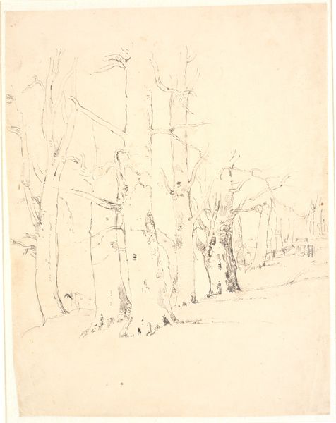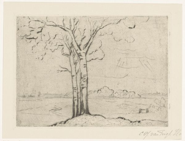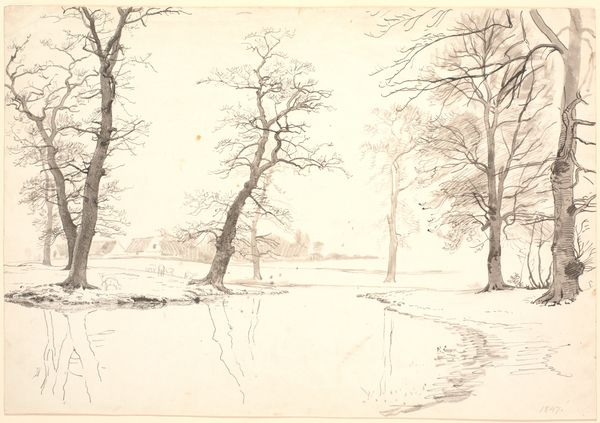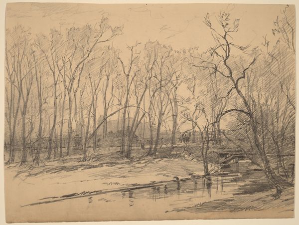 Curator: Alright, let’s take a look at "Meadow Pond, New York" by Charles Frederick William Mielatz. It’s a lovely graphite and pencil drawing, possibly an etching as well, capturing a tranquil landscape scene. Editor: First impression? Hauntingly beautiful. It's so delicate, so fragile. Like a memory fading at the edges, barely clinging to existence. All in grayscale; just the pond, the trees, and a ghost of a house in the distance. Curator: Precisely. The realism, though gentle, anchors it. Mielatz created this drawing in the late 19th or early 20th century when realist landscape art was gaining popularity, depicting nature in a more accessible way for urban audiences. Editor: It reminds me of the Tonalist movement; focusing on mood and atmosphere above detail. You almost feel a cold dampness emanating from the pond and soaking the thin grass, even through the drawing medium. What was the point, socially, of a drawing like this at the time? Curator: I think this artwork is accessible and shows nostalgia for simpler ways of life that resonate especially with emerging city residents. Mielatz was keen on printmaking too; producing images to democratise art ownership and portray this pond as public space accessible through mass consumption! Editor: Very democratic indeed, capturing nature through mass-producible art and that pond as common experience! Looking at the way he renders the reflection, you could be mistaken by not immediately figuring it as something made of pencil marks. It truly makes you want to pack a little bag and settle by that bank, watching the day wither away... Curator: He masterfully captured light and reflection with simple means. It really speaks to the power of art in capturing a particular place in time. This pond, maybe just an ordinary one for him, has outlived not only the man himself, but his vision of democracy too. Editor: Yeah. Its silence certainly persists and outlasts the era. And thanks to this piece, this small pond has become some form of quiet immortality too, I guess!