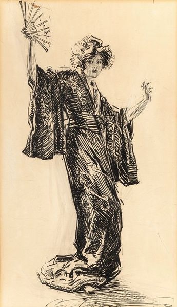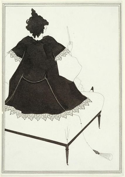 Editor: So, this is "A Virginia Cousin & Bar-Harbour Tales," a poster print from 1895 by Ethel Reed. I'm struck by its simplicity and the almost ephemeral feel. The subject seems so fragile, yet empowered at the same time. What do you see in this piece? Curator: It's interesting you say "empowered." Reed was indeed part of a wave of independent women artists at the turn of the century. I think situating this image in that context reveals interesting tensions. Editor: Tensions? Like what? Curator: Well, consider the subject matter. “Virginia Cousin” and “Bar Harbour Tales” evoke very specific worlds of wealth and social status at a time of great social change. Reed, as a young woman forging her own path in the art world, both participates in and perhaps critiques those worlds. How do you read her portrayal of women within this social structure? Editor: That's a good point. The woman is beautifully adorned, and appears self-assured. Perhaps Reed wanted to highlight both their beauty and relative confinement in high society? Curator: Precisely. Also note Reed’s brief, and at times troubled life – think of how she used her artwork and printmaking in general to disseminate more radical political messaging on feminism and free love, at a time when women’s social and political roles were rapidly transforming. The poster isn't simply decorative, is it? Editor: No, not at all! It speaks volumes about the complexities of women's lives during that period. I see how you brought intersectional feminism into interpreting the artwork! Curator: Glad I could provide this background! Every work of art is deeply connected with broader histories, discourses, and philosophies. And now it's up to us to discover their complex stories!