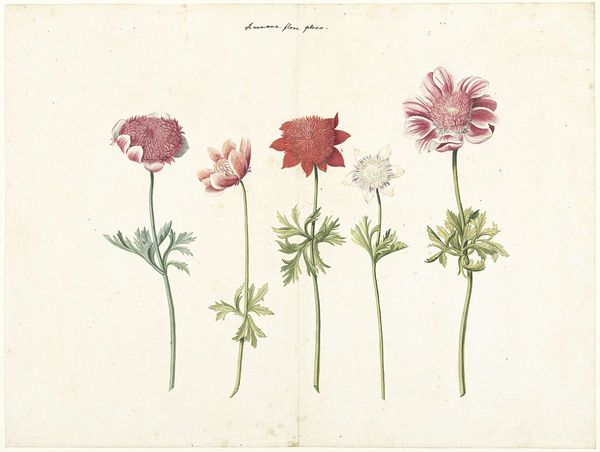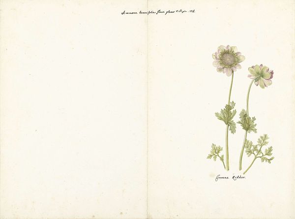 Editor: Right, so here we have 'Three Studies of Anemones' from the 1760s, a watercolor drawing by C. Baak. The delicate detail gives it this quite restful feeling. What strikes you when you look at this? Curator: Restful, yes, that's lovely. It reminds me of pressing flowers in my grandmother’s attic; there's a gentle reverence to nature here. But beneath that delicate surface, don’t you feel a subtle tension, perhaps the artist grappling with capturing the fleeting beauty of these blooms? Almost a quiet struggle made even more relevant given the context of artistic styles in the 1760s, the Age of Enlightenment no less. Editor: A struggle? I hadn't thought about it that way. I was just appreciating the prettiness of it all. Curator: "Prettiness," certainly! But also, consider the dedication required. Each tiny petal, each carefully rendered leaf...it is pure devotion. But in the artistic eye, a botanical drawing also represents an exercise in taxonomy. It makes me wonder what those studies were originally intended for. Do you think they were intended as pure decoration, or for botanical study? Editor: Hmm, I lean towards botanical study. The little handwritten labels beneath each one seem kind of scientific. Curator: Precisely! Imagine, this was created during a period of intense scientific discovery; perhaps C. Baak saw a deeper harmony between art and science? Maybe seeing both is necessary. Editor: Well, I’ll definitely never look at a flower the same way again. Curator: Exactly, that's the point! Anemones and analysis – art gives you new eyes.