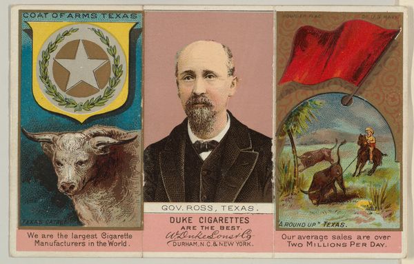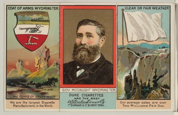Editor: Here we have "Governor Luce, Michigan, from 'Governors, Arms, Etc.' series," dating from about 1885 to 1892, made by W. Duke Sons & Co. It’s a colorful print with an image of the governor flanked by what appears to be a coat of arms and a lumber scene. It feels like a mix of political portrait and advertisement. What symbolic language can you unlock in this peculiar card? Curator: The card speaks volumes about the era's values. The juxtaposition of Governor Luce with the imagery of industry – the lumber scene, the yacht club flag, even the coat of arms with its implication of civic power – positions him as a figure intrinsically linked to Michigan’s economic prosperity. Editor: So, the symbols are tools to associate Luce with success? But why include the image of lumbering at all? It seems almost... disconnected. Curator: Not disconnected at all. Lumbering was a major industry in Michigan at the time. The felled trees represent the harnessing of natural resources, and progress. What does that juxtaposition suggest about the deeper cultural memory and values being invoked here? Editor: Perhaps it suggests a vision of the governor as someone who facilitates or embodies the state's exploitation-- or development -- depending on your point of view? And framing it as a symbol of progress is, itself, revealing. Curator: Precisely. The symbols are not merely decorative; they're actively constructing a narrative. This little card encodes how the tobacco company W. Duke, Sons & Co. wants the public to remember their product and the figure of the Governor as images of commercial and political promise. Editor: That's amazing. It’s incredible how much cultural information can be packed into a seemingly simple advertisement! Curator: Indeed. By decoding the visual symbols, we start to appreciate the narratives an image wants to construct and how it’s connected to wider historical and political currents.