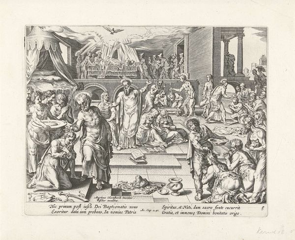 Editor: This engraving, titled "De Efeziërs verbranden hun boeken in het openbaar," was created by Bernard Picart in 1702. The line work is so intricate! What strikes me is the staged nature of the composition; there's almost a theatrical quality. How do you interpret this work from a formal perspective? Curator: Indeed. Note the composition's bilateral symmetry, enhanced by the implied lines converging toward the central figure elevated on a platform. The spatial organization leads the eye directly to him. Observe, too, the dramatic use of light and shadow; this enhances the emotional weight of the act depicted. Do you see how the burning books become a focal point not through placement, but through the contrasting tones around them? Editor: Yes, the books create this dark, active shape, contrasted with the lighter clothing of the figures. How do you think the artist manipulates line to convey this dramatic moment? Curator: Picart's expert employment of line does a great deal to give shape and texture within a restricted palette. Hatching and cross-hatching defines form and suggests volume; consider, especially, the drapery, and the implied weight of those fabrics. The density of the lines in the background compresses the crowd, almost overwhelming the space; in contrast, the lines of the architecture are stark and create order. The varying densities emphasize the chaos and destruction in the foreground against the implied stability of the building. Editor: So, the tension between the architectural structure and the dynamic crowd emphasizes the transformative nature of the book burning itself. Curator: Precisely. The entire composition, including use of lines, functions as a visual argument, guiding the viewer towards its intended meaning and morality. Editor: I've never really considered how formal elements can underscore an argument! That has helped me to view prints like this with fresh eyes. Curator: And I find that these works, through their composition and stark contrast, invite such close readings.