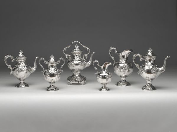 Editor: Right now we’re looking at a silver tea and coffee service, created between 1859 and 1873. It was gifted to J.D. Preuyt, a farmer and mayor, for his jubilee. The craftsmanship is just incredible. How does materiality inform the meaning of this piece, in your opinion? Curator: Let’s consider the silver itself. It signifies wealth and status, of course, but also reflects the economic realities of 19th-century Dutch society. This wasn’t just about displaying art; it was about showcasing industrial capability and trade networks. Silver mining, processing, the labour involved in shaping this set, and its presentation – these are all parts of the story. Editor: So, it's not simply about aesthetic beauty but more about the socio-economic conditions that enabled its creation? Curator: Precisely. Think about the access to materials required, the specialization of labour in workshops, and the celebratory gifting culture connected to figures of power, which is linked to networks of consumption and trade. Consider the ceramic elements alongside the silver. Each material tells a different story of extraction, production, and circulation. Who mined the silver? Who fired the ceramics? How did those labourers benefit from its use by a prominent official? Editor: That perspective really opens it up. I was initially focused on the aesthetic qualities but now I am appreciating the complex network behind the materials and manufacturing. Curator: Exactly! By exploring materiality, we begin to move beyond formalist readings and instead contextualize art within material culture. Hopefully this encourages a richer understanding. Editor: It certainly does. I'll never look at a silver teapot the same way again! Curator: Me neither!