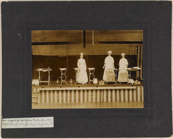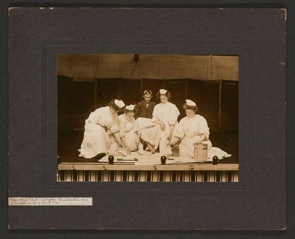 Curator: This photograph by Woodhead Studio, titled "Defectives, Epileptics: United States. Massachusetts. Palmer. State Hospital for Epileptics: Mass. Hospital for Epileptics - Graduation 1907. Plaster cast of foot #2" captures a scene from the Palmer State Hospital for Epileptics. Editor: There's a strange, almost clinical stillness to it, isn't there? The white gowns and the somber expressions... It evokes a strong sense of institutional life and its rituals. Curator: The image’s power lies in its depiction of labor, specifically the labor of care within the hospital setting, and also how the production of plaster casts becomes both documentation and a kind of spectacle. The materials and processes tell a story of early 20th-century medical practices. Editor: Absolutely. Note also the symbolic weight of the foot itself - traditionally linked to journeys, progression, and stability. Here, it's a fragmented symbol, imbued with the anxieties surrounding illness and disability at that time. Curator: It really highlights the intersection of medical practice, social attitudes, and the physical constraints placed on individuals deemed "defective." Editor: Yes, it’s a layered image, prompting reflection on how we perceive and represent vulnerability. Curator: It's fascinating to consider the socio-economic and labor forces that went into this image and similar kinds of clinical processes. Editor: Indeed, a potent reminder of how symbols can both reflect and perpetuate cultural biases.