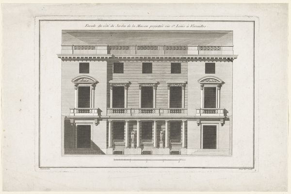 Curator: Let's consider Falda's etching, "Façade van Palazzo Valentini," made after 1655. The stark lines present an almost architectural coolness. I'm curious about the labor involved in its production and the context of its consumption. What are your initial thoughts? Editor: Well, the building itself appears very structured, but the etching gives it a sense of remove. Thinking about its creation, I am wondering, what drove Falda to painstakingly produce such detailed depictions of architecture through this medium? Curator: A crucial question. We can't separate this image from its production. Falda, as an etcher and printmaker, was participating in a market economy. This print, and others like it, served as documentation and promotion of Roman architecture, a form of visual capital circulated amongst wealthy patrons and other architects. What does this tell us about architecture itself? Editor: That architecture wasn't just about creating buildings but about marketing a lifestyle and certain societal ideals! These weren't just drawings, but a form of advertisement... almost like an early form of real estate brochure. Curator: Precisely. And the very process of etching - the acid, the metal plate, the physical labor involved – distances us from the purely aesthetic appreciation of the building. The print makes visible the complex system of patronage, skill, and commerce intertwined within art production of this period. Think of the consumption and the class system tied to art back then; how does this impact the world of art today? Editor: That makes me think about who had access to these images and therefore who was influenced by them! The original drawing served as both art, but more so, advertisement to influence the architectural trends and consumption patterns of the elite, while keeping common people distanced by means of affordability and access. Fascinating! Curator: Absolutely. It encourages us to view Baroque art beyond idealized forms and consider the materiality and systems that enabled its creation and circulation. Editor: I’ll definitely be thinking about art in terms of production and social consumption from now on!
