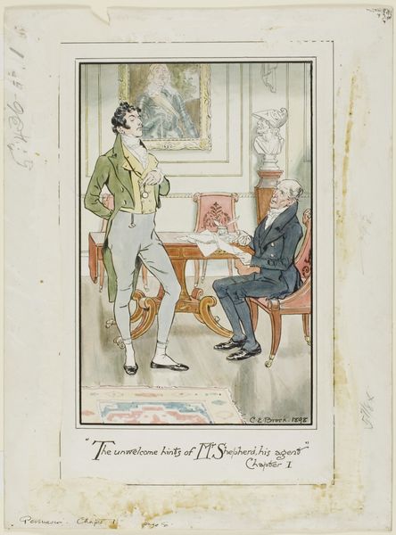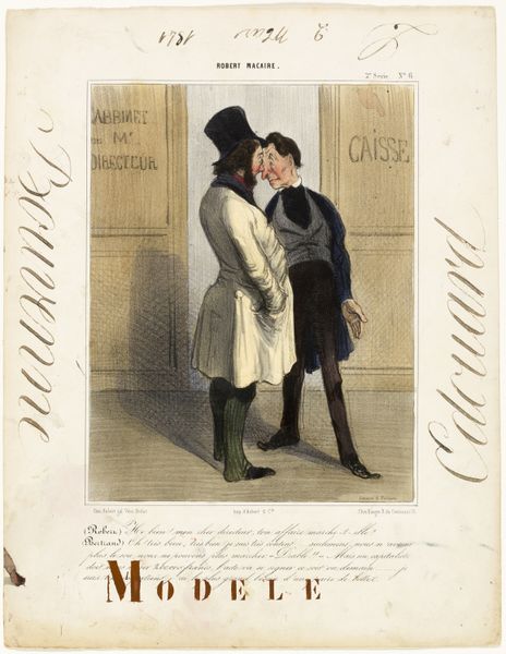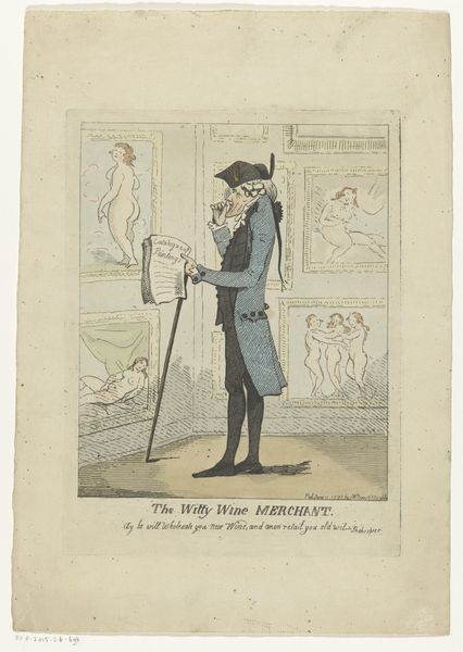 This print, titled "The Concave Petitioner: The Taste of the Day, no. 33," was created by an anonymous artist. Its composition immediately strikes the eye through its unusual form. The figure bends into a pronounced concave shape, almost echoing the title's description. The lines of his body create a curve that seems to defy natural posture, introducing a sense of tension and unease. We see how the artist employs the form as a visual metaphor for supplication or perhaps even social discomfort. The use of color is restrained, with muted tones that further emphasize the figure's odd form and the rigid geometry of the room. The background setting features a picture within a picture, and linear details such as floorboards and wallpaper, which add depth. Overall, the print functions as a commentary on societal norms and human interactions. This piece destabilizes conventional notions of composure and challenges us to question the structures of power and representation.