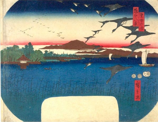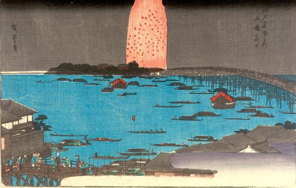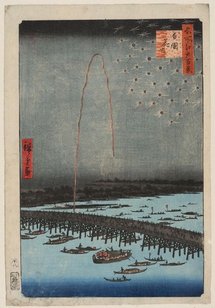 Editor: So, this woodblock print, "Fireworks at Ryōgoku Bridge," dating back to around 1832-1834, is by Utagawa Hiroshige, and it's currently housed here at the Minneapolis Institute of Art. There's a really interesting tension between the flat planes of color and the implied depth, and that vibrant burst of firework red against the dark sky! What strikes you when you look at it? Curator: What strikes me, hmm... It's funny, isn't it? Here's this explosive celebration, this fleeting moment of intense beauty rendered with such stillness and quiet observation. Imagine being there, crammed onto one of those boats, cheek-to-cheek with strangers, the air thick with smoke, all craning your necks to catch a glimpse of ephemeral blossoms of light. Hiroshige distills that frenetic energy into something serene. Do you see how the bridge seems to connect earth and sky, how the boats reflect the glowing colors in the water? Editor: Absolutely, I see the stillness in the chaos. It almost feels dreamlike because of that contradiction. Did this type of imagery have a name? Curator: Good question. It does. This is *ukiyo-e*, pictures of the floating world. It was all about capturing everyday life and pleasures, like… well, like a fireworks display! It’s the ultimate in celebrating ephemeral beauty, something transient. Everything becomes a little sweeter, knowing it cannot last, don't you think? And that single red stroke of fire against a deep indigo blue, my oh my… Editor: That makes perfect sense. It is very wistful now that you point out that the aesthetic revolves around such everyday subject matter! Curator: It's about cherishing fleeting moments, something maybe we could all use a reminder of. Even when the sky is a bit grey, and fireworks are but fading embers. What do you take away? Editor: I'll definitely be thinking about appreciating those brief moments of beauty – maybe next time I see fireworks, I’ll think about this print. Thanks!