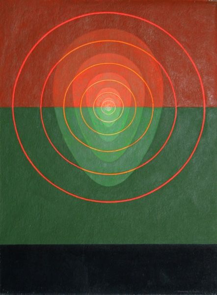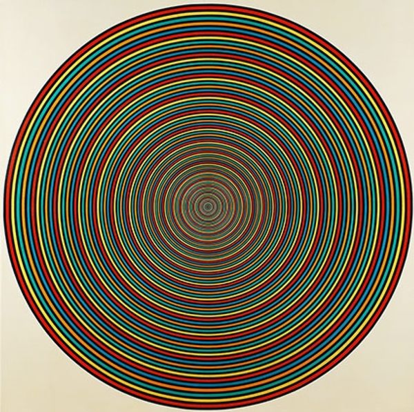 Ronald Davis made Roll Your Own (Zig-Zag) with a very controlled, almost obsessive application of paint. The colours are really specific - a warm orange, a cool green, and a stark black and white. I think this isn’t just about colours though, it’s about how shapes can play tricks on your eyes. See how the lines and squares give the painting a kind of depth, like it’s curving away from you? I think painting is an ongoing experiment where artists keep borrowing and building on each other’s ideas. I see connections to Bridget Riley's Op Art and Sol Lewitt's use of geometry. Ultimately, this piece is about seeing what happens when you push an idea to its limit, embracing the ambiguity and multiple interpretations that arise.
