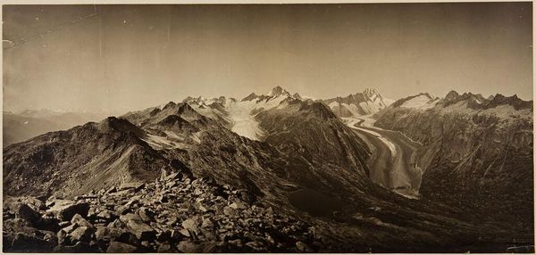 Adolphe Braun made this albumen print, "Mont Blanc from Col de Balve," in the mid-19th century. This photographic process, popular at the time, involved coating paper with a layer of egg white—the albumen—mixed with salts, before being sensitized with silver nitrate. This gave the final image a glossy surface, and the sepia tones we see here. Braun was a textile designer who turned to photography, and in a way, he treated it like a manufactured product. He became known for large-scale landscapes, often printed in multiple sections. This commercial approach extended to employing a large team of assistants. The making of this image was no doubt labor-intensive, from the chemical preparation to the arduous task of transporting equipment up to the Col de Balme. Yet, the final print presents a seemingly objective view, a romantic vision of nature untouched. Considering this, we can reflect on photography’s complex relationship to both artistic expression and industrial production.