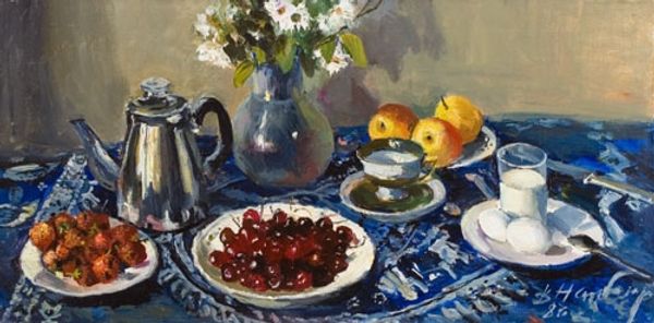 Curator: So, we’re looking at "Blue and Orange" by Dan Graziano, an oil painting, though the date isn't specified. The initial feeling I get is of comfortable domesticity. It’s a traditional still life, and it feels, well, still. What strikes you? Editor: It definitely has a warm, inviting feel to it! The composition, with the oranges and teapot, is pleasing. What do you see in this piece from your perspective? Curator: I’m drawn to the materiality of the objects depicted. Look at the impasto technique; the way the thick paint creates texture, almost sculptural. You can see the labor, the deliberate application. These are not just representations of fruit and porcelain; they are evidence of the artist's actions, the transformation of raw materials into an aesthetic object. Even the way light falls - is it a representation of some kind of domestic labor of creating light or warmth in a household? The fruits of labor in the fields on display. Editor: That's fascinating. So, you're focusing less on what's *depicted* and more on how it was made and its possible connections to a life of work and creation. Curator: Precisely! Think about the origins of the oil paint itself – linseed oil, pigment extraction – and the firing of the porcelain. Even the cultivation and harvest of oranges. The work hints at social practices that define what the objects are beyond what we perceive, like production, use and social habits. What does a tea service and fruit offering signify for people using these items, maybe daily? Where does this artwork intersect? Editor: That puts a whole new perspective on it! I was seeing a nice arrangement of objects, but now I see all the hidden layers of production and even what those elements signify for people using them. I think this has given me new insights. Curator: Indeed, a materialist approach asks us to see art not just as image, but as a physical manifestation of human effort and social conditions. Editor: I will definitely approach artworks from that point of view too now. Thanks for expanding my horizon!