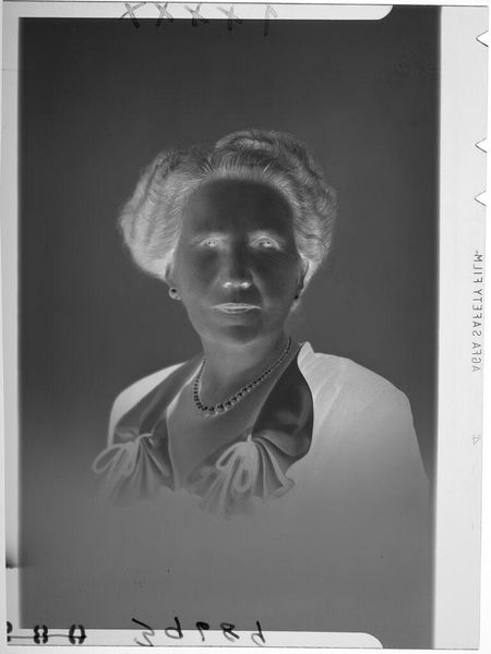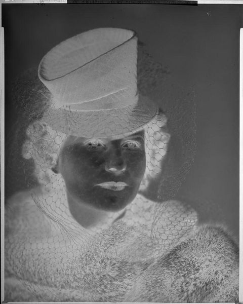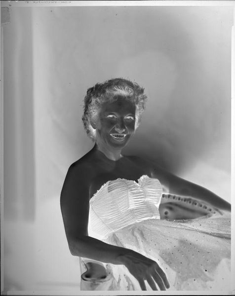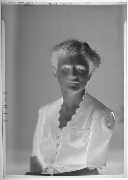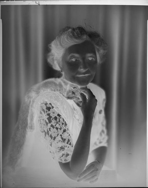 Curator: Let's discuss this silver gelatin print at the Harvard Art Museums. It's an untitled portrait by Martin Schweig, depicting a middle-aged woman. Editor: The stark contrast of the photographic negative lends her a spectral quality. It's as if she's materialized from memory. Curator: Indeed. The composition is quite formal, with the subject centered and posed, yet there's a softness in the lace detailing of her dress. Editor: I wonder if the artist wanted to use that starkness to reveal something deeper, perhaps highlighting her strength, or resilience? Curator: Given the lack of context, we can only surmise. Perhaps the averted gaze suggests a quiet thoughtfulness. Editor: It's a potent reminder that even in what appears straightforward, there’s a world of unexplored narrative. Curator: Absolutely. The artwork prompts reflection, inviting viewers to imagine and to empathize.
