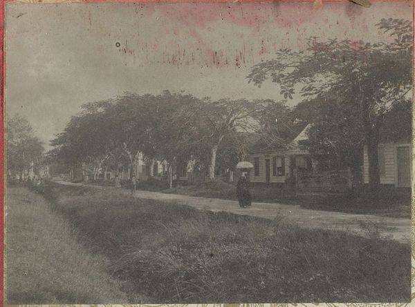 Curator: Take a moment with this serene vista. It is an early photograph titled "Gezicht in een dorp," placing us somewhere between 1903 and 1907. Editor: The first impression is overwhelmingly tranquil. The sepia tones lend it a timeless quality. I’m immediately drawn into the receding lane, as if invited to stroll through the village myself. Curator: Precisely! It invites contemplation. The arrangement, particularly that division of space with the path leading into the village between these humble structures, invites an allegorical reading concerning identity and place. These borders serve as an important space that these early villagers had to deal with. Editor: Indeed, there’s a potent symbolism inherent in the photograph. Consider the looming trees, their canopies almost touching overhead like guardians. Do you see a possible connotation related to nature's omnipotence or maybe an aspect of community? Curator: The trees provide shade, a source of shelter in an unseen sun, and remind us of nature’s constant negotiation with human encroachment, wouldn’t you say? I also see how people interact along these narrow paths and it causes me to pause and ponder the relationship and balance between identity, labor and power? Editor: It resonates. This piece feels far removed from today’s breakneck pace, with layers of nuance embedded into each element of the landscape and construction, giving a unique point of view to daily village life. Curator: Absolutely, this early landscape reminds us of the foundations upon which so much subsequent colonial power was asserted; a record of life before it could no longer exist. Editor: I appreciate your ability to weave social critique into our interpretation. It reframes my initial serene read into a more critical engagement with history. Curator: Likewise, your observation of recurring motifs and imagery helps to situate this landscape within the broader history of landscape paintings and landscape politics in general. Thank you. Editor: Thank you as well. It’s always fruitful to reassess perspectives!