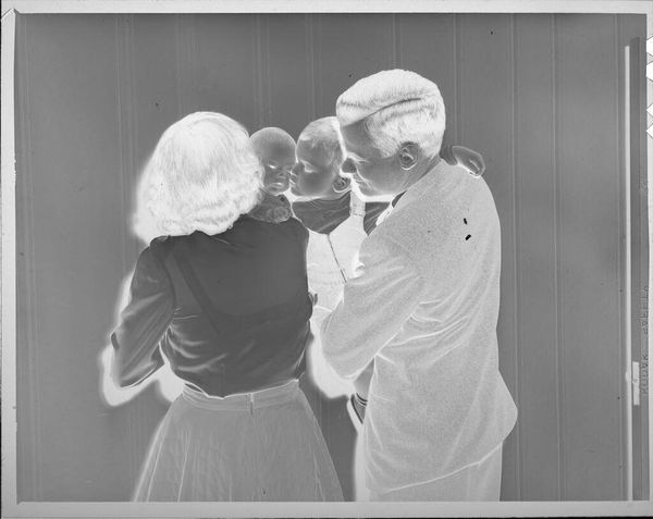 Editor: This striking untitled photograph by Lucian and Mary Brown captures a cluster of boys peering at a baby on a changing table. It's incredibly intimate, almost voyeuristic, don't you think? What's your take on this family tableau? Curator: It tickles my fancy because it feels like stolen moment. The inverted tones heighten that sense of peeking behind the curtain, don't they? It's as if the Browns caught these boys in a moment of pure, unfiltered curiosity. What do you suppose they are thinking? Editor: It is hard to tell. Maybe this photo is not so intimate but more distanced and raw than I first assumed. Thanks! Curator: Indeed, art is often a mirror reflecting ourselves. It's what makes this piece so intriguing.