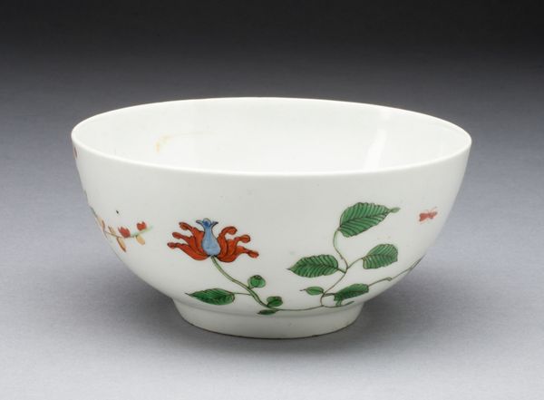 Editor: Here we have a "Punch Bowl," crafted around 1770 by the Worcester Royal Porcelain Company. It's made of beautifully painted porcelain and is currently held in the Art Institute of Chicago. The playful imagery really strikes me – it's lighthearted and intricate. What are your initial thoughts on its composition and decoration? Curator: The Worcester Punch Bowl presents a fascinating study in Rococo decorative arts. Note the curvature of the bowl itself, its gently flaring lip offset with a delicate gold banding. These elements immediately communicate refinement and luxury. Furthermore, consider the narrative band encircling the bowl's exterior. Each painted vignette, framed by stylized foliage, creates a rhythm that guides the eye. Editor: It's interesting you mention the "narrative band." I was focused on individual scenes. Do you see a connection between these scenes? Curator: Perhaps. But more intriguing is the use of negative space. The blank white porcelain is not merely a backdrop but an active element in the design. It separates the individual scenes, yes, but more importantly allows for the vivid colors to exist in harmony. Can you imagine how the composition would shift were it saturated with colour? Editor: I see what you mean. The negative space really accentuates the colourful elements. So you're saying the key isn't the story it tells, but how the shapes and colours interact with the physical form of the bowl? Curator: Precisely. It's a study in form, color, and balance – a delightful and intricate example of its type. Editor: This perspective shifts my focus away from the content to really look at the bowl as an artistic arrangement. Thank you.