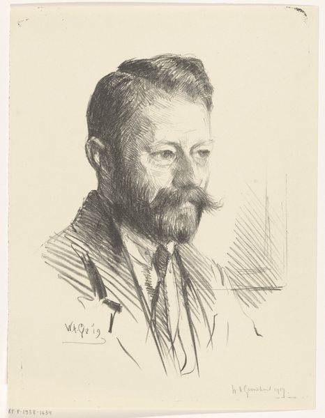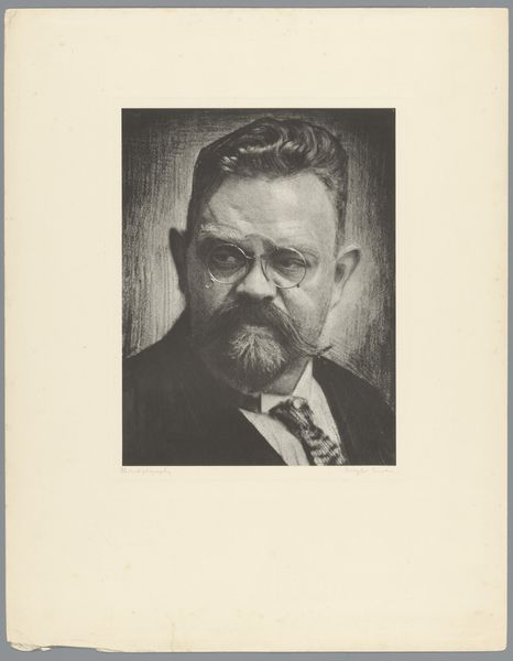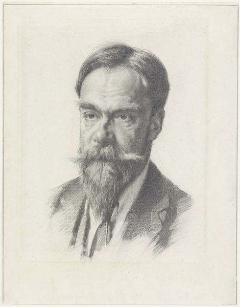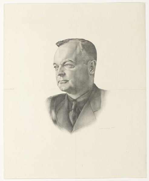 Editor: Here we have Victor Hammer's "Dr. Viktor von Geramb" from around 1935, rendered in graphite. It’s a striking portrait. There's a somber, almost academic air about it. What do you see in this piece, and how would you interpret it? Curator: Well, looking at this portrait through a critical lens, the context is crucial. This was created in the 1930s, a period of rising nationalism and political tension across Europe. A portrait, seemingly straightforward, can actually be a site of power and representation. How do we read Geramb's identity within this historical moment, particularly through Hammer's artistic choices? Editor: That's interesting. I hadn't considered the broader historical context. Does the style of the portrait itself tell us anything about that? Curator: Absolutely. Consider the somewhat rigid posture and the serious expression. This isn’t about individual expression, is it? Portraits, especially of this kind, often functioned to legitimize the subject, to solidify their position and project a particular image aligned with the values of the time. What might the artist want us to think of Geramb? Editor: I see what you mean. It's less about capturing a personality and more about presenting a figure of authority and respectability. Curator: Precisely. And it prompts us to question: whose authority? Whose respectability? What are the unspoken values being upheld here, and whose voices might be marginalized in this representation? Looking at portraits means grappling with how identity, power, and representation intersect within specific cultural and political landscapes. Editor: This has really opened my eyes. I now see portraits in terms of how social forces shape them and vice versa. Thanks so much! Curator: It’s a two-way street. These kinds of portraits allow us to continue examining identity construction throughout history.