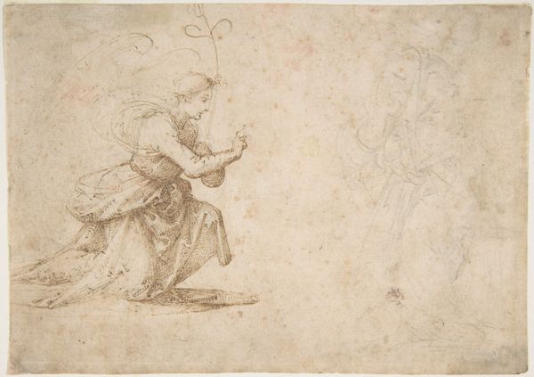 Curator: This sanguine drawing, done by Francesco Allegrini between 1624 and 1663, is called "Group of Standing and Seated Female Figures (recto); Costumed Female Figure (verso)." Editor: There's something immediately appealing in its lightness. Like figures glimpsed through a mist, sketched memories. The red chalk feels delicate. Curator: Delicate indeed! Sanguine chalk was perfect for rendering flesh tones, adding that breath of life to sketches. Look at how Allegrini layers the strokes. It’s a workshop sketch—you can practically hear the rustle of costumes! He’s exploring arrangements. Editor: The arrangement speaks volumes, especially the seated figures clustered around the standing one. Is it just me, or does it echo ideas of social rank or power structures embedded within Renaissance society? How accessible were these materials, what stories do they tell of labor within his workshop? Curator: Good question! Access to drawing materials and how an artist used them were absolutely part of social meaning, class divisions... But to me, this study exudes something spiritual as well, as Allegrini played with composition for larger narrative painting commissions, potentially religious. What does the labor of creativity *feel* like, at the start of a process? Editor: Well, these aren’t idealized figures; you see his process. He's not afraid to show how making the sketch becomes this sort of labor-- that makes it powerful and challenges the notions of "high art" in Renaissance art that relied on expensive materials, precise execution, and so-called "flawless" representation. Curator: Beautifully said. But beyond technique, do you not get the sense of reverence here? Maybe these sketches hint at Allegrini’s devotion as he was planning out paintings for some church commission. Look how the red ink evokes warm feelings and almost spiritual feelings. Editor: Maybe...or maybe that's how we've been taught to *feel*! It could all come back to how this raw, seemingly insignificant drawing was later deemed worthy by collectors. The way value is assigned shifts our perceptions even now. Curator: Right you are...a good reminder that materials and artistic interpretation are both lenses! Editor: Agreed. A sketch holds history, even without trying to, in every mark, in every revision, and ultimately changes art history through process.