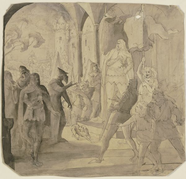 Editor: This drawing, "David and Abigail" by Domenico Mondo, seems to be made of ink and charcoal, and is currently at the Art Institute of Chicago. I'm really drawn to the dramatic contrast between light and shadow, almost like a stage production. How do you interpret this work? Curator: That's a great starting point. I see this piece as engaging with the power dynamics inherent in religious and historical narratives. Consider Abigail's role: she is interceding to prevent violence. Think about the period in which Mondo was working. How might contemporary debates around gender, power, and religious authority influenced his depiction? Editor: That’s interesting. I hadn’t considered the gender aspect so deeply. So, it's not just about illustrating a Bible story, but about examining the roles of the players involved, especially Abigail's agency as a woman? Curator: Precisely. And what about David? Is he portrayed as a divinely chosen king or a man swayed by a woman's intervention? Mondo might be prompting us to question traditional interpretations of power and morality in this biblical scene. Think, too, about whose stories get told and from what perspective. Editor: So, you're suggesting Mondo is less interested in simply depicting a historical event and more invested in using the scene to comment on broader social and political issues of his time? Curator: Exactly. Art doesn't exist in a vacuum. By understanding the historical context and applying contemporary theoretical frameworks, like feminist theory or critical race theory depending on the subject matter, we can unlock deeper layers of meaning in these artworks. How does understanding Abigail’s intersectional experience shed new light on the story's enduring appeal? Editor: This has given me so much to think about; I hadn't really considered the activist potential embedded in older works of art! Curator: Precisely, engaging with art, requires that we look deeper, past surface representation and historical understanding into broader sociopolitical analysis and intersectional considerations.