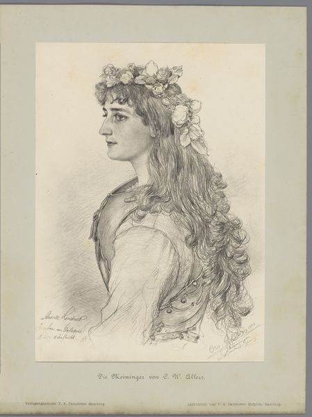 Christian Wilhelm Allers created this portrait of Amanda Lindner using pencil, placing her within the context of late 19th-century Germany, a period marked by industrial expansion and cultural shifts. This image presents Lindner in a juxtaposition of contrasting symbols. Crowned with flowers, suggestive of innocence and beauty, she's also adorned with a suit of armor, an emblem of strength and defense. Allers seems to be engaging with the era’s debates around femininity, perhaps challenging conventional portrayals of women as passive. Does the armor protect her delicate beauty, or does it arm her for a more active role? It invites us to contemplate the multifaceted nature of identity, the tension between vulnerability and strength, and the complex negotiations of gender in a rapidly changing society. It's a tender yet powerful representation of a woman navigating her world.