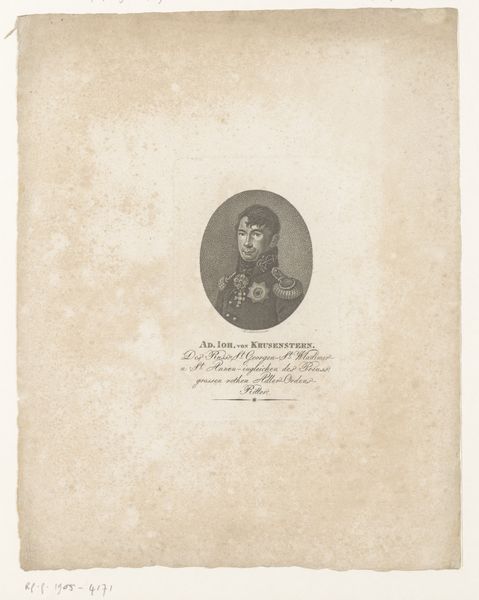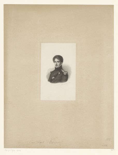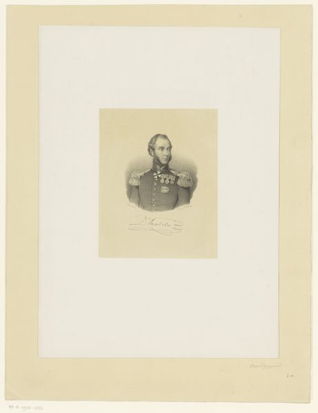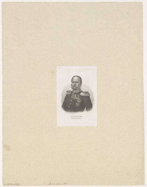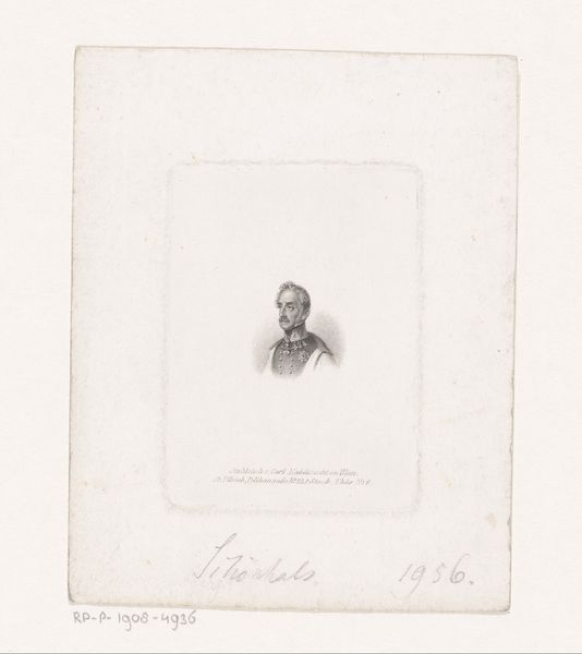 Editor: Here we have a print of "Portret van Adalbert, prins van Pruisen," made between 1830 and 1911 by August Volkert. It seems to be an engraving. There's a certain formality and precision to it that’s very striking. How would you interpret this work? Curator: The formal portraiture, particularly of Prussian royalty, needs to be understood in its political context. Portraits like these were often commissioned to project power, legitimacy, and stability. Consider how the uniform, the sharp details achieved through engraving, and even the inscription "Prins de Pruessen" all contribute to a very specific message. What kind of message do you think that might be? Editor: I suppose it projects an image of strength, military prowess perhaps? The uniform is pretty emphatic. Was Volkert, the artist, perhaps employed directly by the Prussian court to create these kinds of images? Curator: Possibly, or it could have been a commercial venture, aiming to capitalize on the public's interest in royalty. The distribution of prints allowed these images to circulate widely, shaping public perception and reinforcing the established social order. Do you notice any element that hints at a particular class? Editor: Definitely the high level of detail in his attire suggests that, also maybe even the seriousness in his eyes hints at high societal expectations. It’s fascinating how many layers are at play here! Curator: Exactly! By examining these images through the lens of social and political history, we can start to unpack their intended function and the values they were meant to promote. Every visual choice supports a broader narrative. Editor: I never thought about portraiture this way before. I always thought of it as capturing just the likeness of the person, not their persona through historical and cultural contexts. Thank you for opening my eyes.