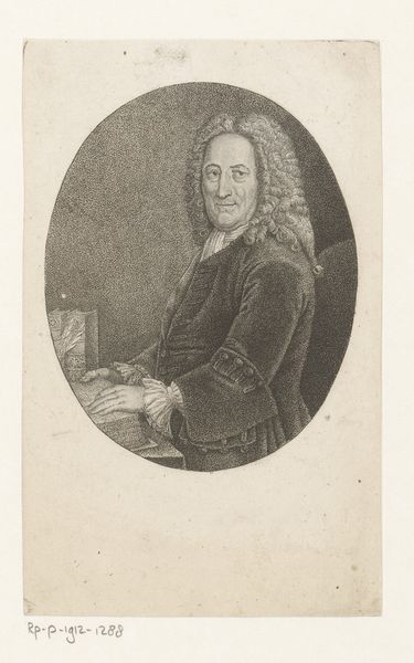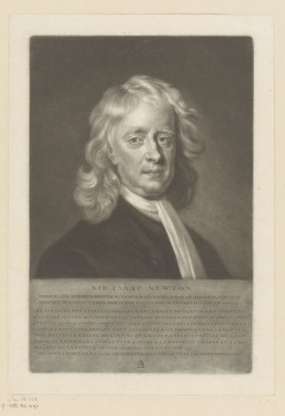 Curator: The lighting is so dramatic! There's a real weight to the darkness surrounding him. Editor: Yes, there is quite a stark effect there. We're looking at a mezzotint engraving from 1760 by James McArdell. It is titled, "Portret van Isaac Newton" and is held here at the Rijksmuseum. It’s an interesting piece to consider within the context of the burgeoning scientific revolution and the popularization of knowledge. Curator: You can really see the mezzotint at work in the texture of the background. The artist coaxed those tonal variations from the plate—it gives it an almost velvety appearance, a very material and textural quality. It’s really beautiful, technically speaking. Editor: Indeed. This was a time when the visual representation of figures like Newton was becoming increasingly important in shaping public perception of scientific authority. Consider the engraving’s distribution; it wasn’t just for private collectors. Prints like these helped to establish Newton as a figure of intellectual power within a wider cultural sphere. Curator: It is compelling to think about the labor involved here. All of those minute gradations of tone were created through a highly skilled, laborious process. Each print pulled carries with it that physical act of making and disseminating the image. This engraving exists, in part, as a consumer good that demonstrates technical mastery. Editor: Absolutely, and what's striking is the way that this portrait elevates Newton to almost a saintly status. The baroque style adds to that sense of reverence. We're seeing not just a man, but an icon manufactured through this very accessible medium. Its purpose speaks volumes about how society viewed intellect and discovery. Curator: It is the accessibility that makes it so significant from a materials perspective. An engraving allowed this image to circulate widely, transforming how Newton’s image and ideas permeated culture. It wasn’t just about showing *him*, but it also affected the transmission of scientific ideas through a wider audience. Editor: Ultimately, this portrait speaks to the powerful intersection of art, science, and society in the 18th century. It reveals the importance of visual imagery in constructing and reinforcing cultural narratives about knowledge and power. Curator: A very fascinating portrait to reflect on. Editor: Indeed!