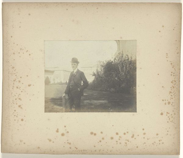 Editor: So, this gelatin-silver print, "Portret van William Home, jurylid op de wereldtentoonstelling in St. Louis (Louisiana Purchase Exposition), 1904," from 1904 by Jan Schüller, has this really formal and reserved feeling. What do you see in this piece? Curator: I see a complex interplay of power and representation. Think about the World's Fair itself – a celebration of industrial progress, but also a reinforcement of colonial power structures and racial hierarchies. Home, as a juror, was a participant in that system. How does the artist subtly acknowledge, or perhaps even critique, that context? Editor: It's interesting that you bring that up, I wouldn't have considered the Louisiana Purchase Exposition through a colonial lens. His pose does strike me as very self-assured. Curator: Exactly. And how does that relate to his identity as a white man in 1904? How much of that self-assuredness comes from inherent privilege? The seemingly neutral act of portraiture becomes a loaded statement. Editor: So, you are saying that beyond this being a straightforward portrait, it’s about examining the power dynamics inherent in representation and the subject's place within a larger sociopolitical structure? Curator: Precisely. Photography, particularly portraiture, wasn't merely documentation. It was also a tool used to construct and perpetuate particular ideologies. I wonder, does Schüller’s artistic choice to stage the subject outdoors against a building add another layer to your interpretation? Editor: That is really thought provoking, looking at how something that appears straightforward can be interpreted through a lens of social context and power. It definitely offers a more profound reading of the piece! Curator: Indeed. Seeing art as entangled in power structures reveals nuances previously unseen and unheard, promoting critical engagement and hopefully, social progress.