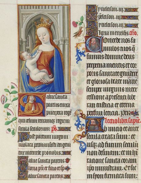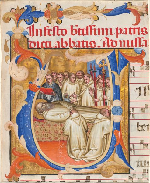 Editor: This is "The Pope and His Cardinals," a tempera, ink, and paint on parchment miniature presumably by the Limbourg brothers, made sometime during the Medieval or International Gothic period. I find the composition quite interesting – the figures are flattened, and the palette is quite limited. What can you tell us about the historical context of this work? Curator: It's fascinating to consider this image within the broader history of the papacy and manuscript production. These illuminated manuscripts were extremely costly, and served as potent symbols of power, reflecting both religious and secular authority. What message do you think it conveyed to its original audience? Editor: Perhaps that the Church was a wealthy institution, capable of commissioning such elaborate artworks? It also looks like the imagery would convey a certain sense of order and established hierarchy. Curator: Precisely. Consider the public role of the papacy during this period. These miniatures weren't just decorative; they were carefully crafted to reinforce specific social and political narratives. The International Gothic style itself, with its elegance and refinement, served to further legitimize this authority. Editor: I hadn’t considered it so explicitly political. So, the choice of materials, the artistic style—everything contributes to constructing a particular image of power. It definitely casts a different light on it. Curator: Yes, and examining who had access to this imagery is crucial. This wouldn't have been for mass consumption. The creation and viewing of such art were carefully controlled. Does understanding its exclusivity affect your interpretation at all? Editor: It does. Knowing it was meant for a very specific, elite audience helps me understand the purpose of the visual language and symbolism used here. It emphasizes the idea of curated power. Curator: Exactly. This conversation just shows that a historical viewpoint, by exploring socio-political forces, can truly reshape how we see even the smallest details within an artwork. Editor: I agree! Thinking about who this artwork was meant for, and the visual strategies the artist uses, makes all the difference.