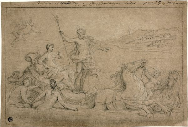 Editor: This is Ludovico Lana's "Study for Ex-voto Picture," made sometime between 1597 and 1646, using pen and ink. The ethereal figures hovering above a landscape create a compelling scene. What stands out to you? Curator: Considering its creation was likely within a specific workshop setting, I'm interested in the labor involved in this seemingly preliminary drawing. The visible pen strokes and the iterative nature of a 'study' suggest a collaborative process. Was Lana perhaps directing apprentices or other artists in realizing a larger, possibly more lavish, ex-voto painting? The material economy surrounding religious art during this period is quite fascinating. Editor: So, you’re saying it’s less about the spiritual message and more about how it was actually made and by whom? Curator: Precisely. Consider the patronage system. Who commissioned this piece, and what was the socio-economic status of the individuals represented in the lower portion of the drawing? The very act of commissioning such a work signifies an investment – a material transaction interwoven with faith. Also, look at the angel’s drapery; a real concern for its visual presence using light and shadow. This might show knowledge of different fabric treatments in a real-world atelier, and it reminds us that even idealized forms take on earthly characteristics because of the materials used. Editor: That’s a really interesting way to see it. I usually focus on the symbolism, but now I'm curious about the paper itself – where it was sourced, the type of ink. Did these materials carry a certain status, contributing to the overall message of the ex-voto? Curator: Exactly! The materiality speaks volumes. It moves our focus to the concrete aspects of art making – labor, consumption, and the exchange of resources – opening avenues for understanding the cultural and historical forces at play. Editor: Thanks! Thinking about the work this way shifts my perspective on Renaissance art quite significantly.
