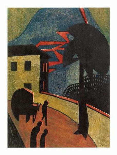 Editor: Kiyoshi Saito's woodblock print, "Ancient City Nara," created in 1957, evokes a quiet, almost melancholic atmosphere with its stark contrasts and limited palette. What strikes me is the looming architecture in the background. As an historian, what's your perspective on this piece and how it fits into the broader cultural landscape? Curator: That feeling of quietude is palpable, isn’t it? I see it reflecting Japan's post-war introspection. Saito, while working within the Sosaku-hanga tradition, moved beyond pure landscape. Here, we're offered a constructed image of Nara. Notice how the sharp angles and flattening of forms pull away from earlier Ukiyo-e traditions which idealized places through travel or tourism. Editor: So, the emphasis shifts from representing a real place to something else entirely? Curator: Exactly. Think about what "ancient" means in 1957. Japan was rapidly modernizing. By titling the print "Ancient City Nara", and depicting the shadowy presence of architecture, Saito critiques modernization itself and uses the image to reflect the tension between embracing progress while grappling with the loss of cultural heritage. What's fascinating to me is that the small cat offers some perspective to this conversation, where progress may forget what still lives in the shadows. Editor: I didn't consider the cat in that context, but now I see it contributes to that air of loneliness and being forgotten. It feels almost like a guardian of the old ways. Curator: A keen observation. Do you think the scale and color choices might play into that as well? Editor: Absolutely, the heavy use of black and the stark, flat application of red give a sense of monumentality but also distance. Like we're viewing something important but inaccessible. It encourages you to contemplate these shadows. Curator: And the print medium itself—the way the woodblock allows for those precise, clean lines—further emphasizes this deliberate construction of memory. A way to process a nation in transition. Editor: This really broadened my understanding, not just of the piece but of post-war Japanese art in general! Seeing it as a response to modernization really gives it another layer of depth. Curator: I agree; it gives us cause to reflect how art shapes a conversation between past and present, which could not be reached without considering what had come to pass socially.