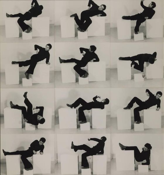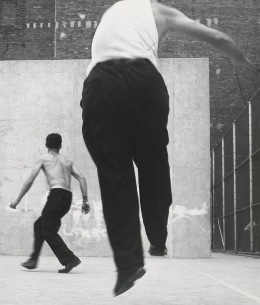 Editor: Leon Levinstein's photograph, "Handball Players, Houston Street, New York," created around 1969, presents a monochrome image of two men in motion. There's a raw energy in this picture; the lead figure’s action feels both athletic and kind of confrontational. What's your take on this piece? Curator: This image powerfully resonates with the documentary photography tradition, reflecting social realities. I see the photograph working within a larger discourse, namely, questioning who has the right to represent reality? Levinstein's gaze here frames urban recreation, specifically for working-class men. Does the choice of representing this demographic rather than a more ‘aesthetic’ one suggest something about social commentary to you? Editor: It definitely shifts my thinking! So it’s about what he chooses to focus on, rather than just how he does it? Is it fair to link it to something like the Ashcan school, emphasizing everyday life? Curator: Absolutely, but with key distinctions. Where the Ashcan School painted immigrant experiences in large city settings, the camera changes everything. It becomes both more democratized and carries new representational challenges and the photographer’s unavoidable subjectivity. Photography brought a level of realism painting struggled to reach. Also, by the late 60s, there were definitely heightened debates about who gets to be the author or voice of the working classes. Does Levinstein bring insider status in representing this activity, or does it rather cast the players as under some scrutinizing ‘outsider’s’ light? Editor: I guess I hadn't considered that! I see this photograph now not only as an image of people playing, but as a snapshot of societal viewpoints, a very loaded perspective. Curator: Precisely. It demonstrates how the photographer can both reveal and conceal societal values in an seemingly straightforward depiction. What we’ve really highlighted here is photography’s potential to become something very rich.