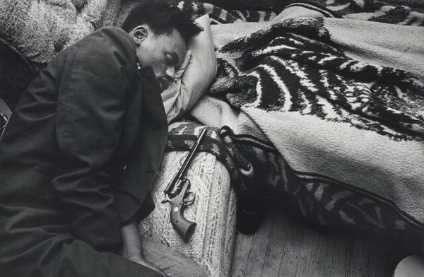 Curator: This image really stops me in my tracks. There's a tenderness, vulnerability...it's like walking into a very private moment. Editor: Precisely. What we're looking at here is an untitled gelatin silver print, most likely from the 1930s. An anonymous photographer captured this scene: a girl sleeping in a bed outdoors. Curator: The car in the background – that boxy silhouette – and the quilt she's under. They almost make it feel... staged? Though staged feels like the wrong word. It's more like a tableau vivant. Editor: Staged perhaps to make visible the desperation of the time. The very act of sleeping outside speaks to economic displacement during the Great Depression. The domestic sphere literally disrupted and exposed. Curator: That old metal bed frame – it’s both delicate and tough. Makes me think about the resilience of folks during that time, trying to hold onto normalcy, even in the face of...everything. And the light is so soft on her face. It’s like the world’s holding its breath while she dreams. Or maybe cries? Is that a tear I see? Editor: Yes, and that single tear really punctuates the precarity of the situation. Sleep, after all, is meant to be a sanctuary, a safe space. But here, the exposure to the elements, combined with what must have been anxieties around survival, transform sleep into a symbol of vulnerability. A visual representation of disenfranchisement. Curator: It hits me on a visceral level, really tugs at your empathy. You imagine the circumstances, what led to that moment, where she might be headed next… And it does raise questions, doesn’t it, about who had the right, even back then, to photograph someone in such a private, exposed state? Editor: Exactly. The power dynamics are inherently unequal. While aiming for realism, the image, in its circulation, may perpetuate exploitation and spectacle, especially when we don't know anything about her agency in the making of the photograph. Curator: Hmm. It’s a striking reminder. This anonymous image has managed to spark quite a dialogue. Editor: Absolutely. It layers individual stories of struggle against collective, systemic issues of gender, precarity, and forced migration. It speaks, in essence, to historical conditions of vulnerability that are sadly still with us today.
