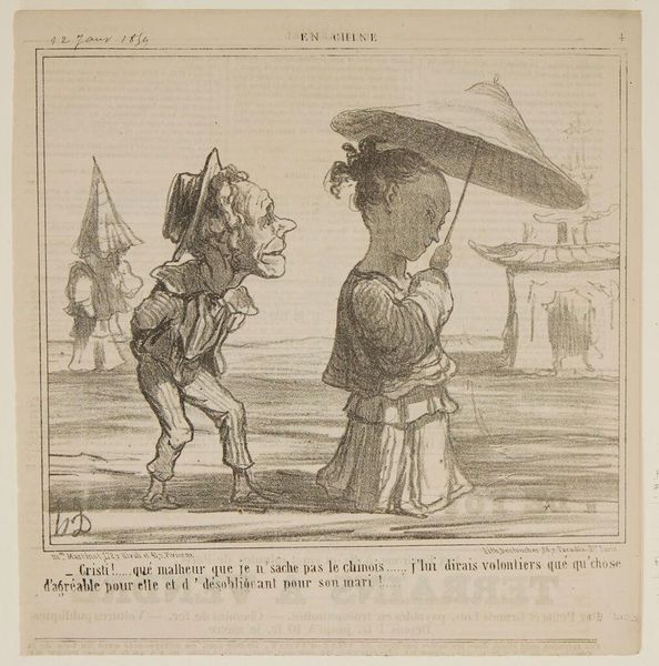 Honoré Daumier created this lithograph titled “- What a shame that I don't speak Chinese...” in the 19th century. The drawing's formal structure centers on the stark contrast between the figures in the foreground and the ethereal, almost dreamlike rendition of the background. Daumier masterfully employs line to delineate form and convey emotion. The sharply caricatured Western man is juxtaposed against the more softly rendered Chinese woman, whose face is turned away. This contrast suggests a critique of Western perceptions of the East, playing with the semiotic codes of dress and posture to underline cultural differences and the power dynamics inherent in the colonial gaze. The artist challenges fixed meanings by portraying the Westerner as grotesque. Daumier's lithograph employs form not merely for aesthetic appeal, but as a tool for social commentary. This piece prompts us to reconsider the values and categories we use to understand cultural encounters. The interpretation of such an artwork continues to evolve, inviting new dialogues across time.