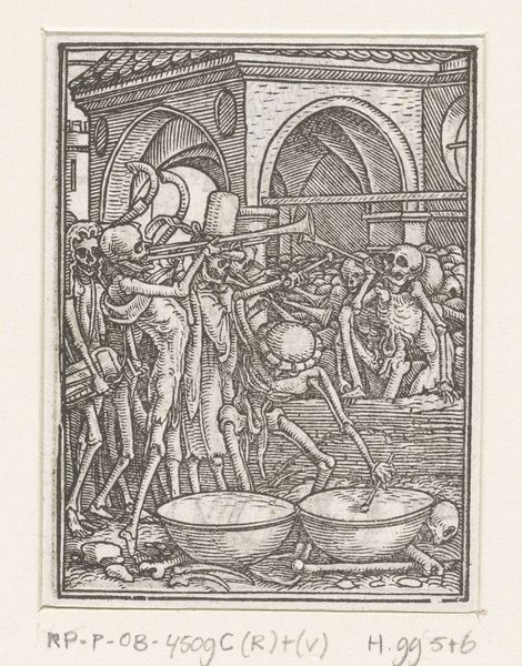 Curator: Here we have "Astronomer and Death" by Hans Holbein the Younger, created sometime between 1524 and 1538. This ink drawing, a print actually, is currently housed in the Rijksmuseum. Editor: My first impression? Grim! The stark black lines really amplify the themes of mortality. It's a claustrophobic composition. Curator: Precisely! Holbein masterfully uses line and form to convey a sense of impending doom. Note the density of lines used to create a flattening effect. Holbein diminishes space. Editor: Definitely! And look at the astronomer's upward gaze, contrasted with the looming presence of Death. The image is riddled with what seems to be, quite literally, a skull staring at another skull! How much loaded imagery can be piled up into one drawing?! Curator: Indeed, Holbein often incorporated symbols into his work. In this print, we observe an allegorical depiction of vanitas. Consider the scientific instruments, such as the armillary sphere above and books on the table; all rendered futile in the face of Death, rendered as a skeleton who snuffs life from the astronomer, who appears ignorant of his fate, pointing to heavens. It reinforces this theme by presenting the futility of knowledge when confronted by death. Editor: Absolutely. The hourglass that is nestled in the Death’s bony arms is so cliché, and so spot on, as it visually drives the limited nature of the mortal human lifespan. The whole thing plays as a ‘momento mori’. It asks viewers to ponder their own mortality and the brevity of life. What gets me is that creepy fellow observing the scene from the back! Curator: A fine point. This scene certainly reminds one that no one is truly free from Death. From a compositional point of view, Death is visually centered, his bony arms resting on the table, becoming part of it, central to the artwork and by consequence inescapable. The diagonal lines, one made by the Death's gesture of suffocating the astronomer, is masterfully contrasted with the other one pointing upwards. Editor: Looking at it, it does invite us to question what truly matters. Thank you. This deathly juxtaposition gives so much to ponder, so succinctly. Curator: Agreed, its strength lies in its concise yet potent articulation of our mortality.