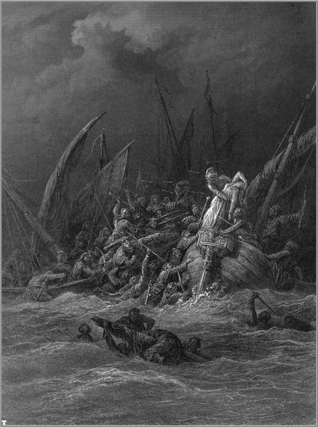 Curator: This engraving is by Gustave Doré, entitled “Idylls of the King.” While undated, it seems reasonable to place this in the latter half of his career, given thematic and stylistic connections with other works that he made around this time. Editor: My immediate impression is darkness, a sense of foreboding. The black ink dominates, barely allowing us to discern figures emerging from the depths of a shadowed forest. There's a definite air of the gothic, perhaps even a hint of the sublime. Curator: Absolutely. Doré was exceptionally skilled at tapping into the visual rhetoric of Romanticism and imbuing it with his own socio-political sensibility. Note how this piece acts as a meditation on the legacy of Arthurian legend as well, perhaps pointing to its influence on conceptions of war and heroism within popular culture. The figures seem trapped, almost staged, within a particularly violent and melancholic narrative. Editor: And that positioning underscores their symbolic weight, doesn’t it? Look at the fallen tree, juxtaposed against the riders. To me, it represents broken chivalry. The upturned roots of the tree also suggest turmoil and perhaps foreshadowing future downfall. Also, that barely discernible castle on the distant horizon, as it looks like an ominous beacon in the tempestuous sky. Curator: Right, that castle! Given Doré's relationship with the Parisian Salons of his era, it's safe to assume that this choice has some specific connection to debates over social decline. Considering the lack of vibrant color, or evidence of a clear composition that lends itself to harmony, Doré presents an opportunity for reflection. What has society gained in pursuit of this glorified narrative? Editor: A crucial consideration. Beyond the surface drama, I discern a powerful commentary on cycles of destruction. Those riders seem almost spectral. Do you think they represent an eternal return to conflict? Curator: I'd be inclined to say so, particularly as this artwork does a brilliant job of revealing and also critiquing dominant societal expectations about history, masculinity, and power. Doré leaves the audience questioning whether honor is attainable, or even desirable, in light of its apparent consequences. Editor: I agree. And the intensity with which Doré conjures these associations speaks to a far broader cultural memory as it pertains to power. It goes beyond mere illustration. It's a visceral statement about the weight of legends and the shadows they cast upon us.