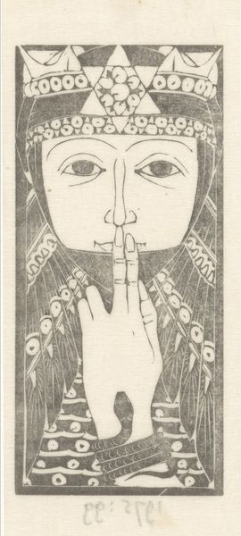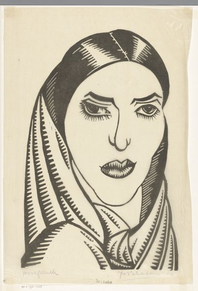 Curator: F. Meyneke's "Madonna," dating to before 1957, presents a striking image rendered in woodcut. What is your immediate reaction to this print? Editor: Well, there's something so severe and serene about her expression. It projects both strength and vulnerability. I see purity and devotion, of course, but also a deep sadness in those geometric eyes. Curator: Absolutely. What strikes me is the artist’s approach to a subject like the Madonna with this relatively humble medium. Woodcut demands a real economy of line, and there's a physicality to the labor involved. We can think about the choices Meyneke made when cutting into the woodblock to achieve this contrast. Editor: Precisely. Those heavy lines framing her face evoke both the halo and architectural structure, yet there's also an almost childlike simplification. The lines appear solid and permanent. But think about how, culturally, the image of the Madonna, the archetype of motherhood, has endured and shifted across centuries. This artist, even working in a readily reproducible print format, has made the iconography his own. Curator: And there’s such clear skill demonstrated in this creation. Meyneke took what may have been available at the time and elevated it to create a very refined statement using line and geometry. You can even see in this particular impression how the hand of the printer and the slight imperfections of the paper itself add to the effect, bringing tactility to the spiritual subject matter. Editor: I find it striking how a medium typically associated with, let's say, less traditionally "fine art" purposes has been used to address such an iconic and spiritually loaded figure. There’s something powerful in that juxtaposition. The weightiness and depth are emphasized in her clothing and the space surrounding her figure. Curator: It truly bridges perceived gaps between art and craft. Looking at the material qualities emphasizes how meaning is embedded in production itself. The lines and printing process really capture both spiritual tradition and a certain maker-based democratization. Editor: This piece challenges preconceived notions. Curator: Absolutely. Viewing the piece through a materialist lens, it highlights art as a product of labor and available resources while your perspective illuminates it as a continuation and transformation of culturally resonant imagery.
