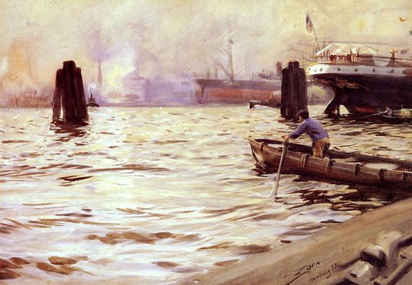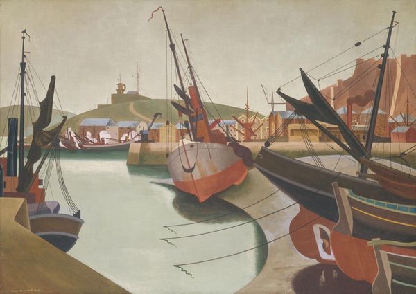 Curator: William Roberts' "The Port of London" presents a scene of industrial activity, dominated by repetitive geometric forms. What’s your immediate take? Editor: It's like stepping back into a dream of industry, all muted colors and quiet labor. Sort of makes you wonder about the stories held within the wood of those old boats, doesn't it? Curator: Roberts employs a muted palette and a careful arrangement of shapes—note how verticals of masts and chimneys contrast with the horizontals of the docks. Editor: Yeah, it's all very structured. Yet, there's this underlying feeling of melancholy in the smoky atmosphere. It's the romance of labor, but with a touch of the inevitable fading, maybe? Curator: Perhaps. Roberts’ work often navigates between celebrating modernity and questioning its impact on human experience. Editor: True. I mean, beyond the formal stuff, it's a real mood piece. Makes you think about progress and its cost, doesn’t it? Curator: Indeed, an interesting intersection to ponder. Editor: Definitely leaves you with a lingering thought or two!