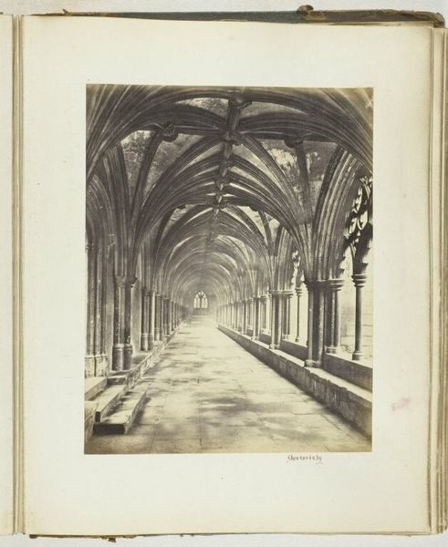 Curator: The cool tranquility in this 1893 photograph, titled "Westelijke kloostergang van de Sint-Servaasbasiliek Maastricht," by an anonymous photographer working with Monumentenzorg...it feels almost meditative, don't you think? Editor: Absolutely. The light spilling into the corridor does create an alluring visual poem, but it also subtly underscores the limitations and strictures within the basilica's confines. Curator: Oh, I love that. It’s true, there’s something very dreamlike and textural about the repetitive arches and solemn, steady march of pillars leading to what looks like the ultimate reveal—light. Editor: Indeed. In historical contexts like this, particularly within the sphere of religious institutions, light itself operates as both a literal and metaphorical motif, invoking salvation, redemption, or sometimes, a cruel absence of fairness. Curator: It also does wonders for softening the harsh, straight edges of what I imagine is a tremendously cavernous place. You’re not dealing with any true colors, obviously, so tone and shadow do all the heavy lifting to convey that sense of sheer scale. Editor: Exactly! And the composition is deliberately implicating us, isn’t it? We're positioned on the periphery, granted a peek into this sequestered realm—simultaneously inside and out, part of a religious whole and kept apart. This makes me think of other enclosed spiritual architectures, the patriarchy implied, and whether all these structures can be a vehicle of faith. Curator: It all makes you wonder about who exactly they were trying to safeguard and what was seen to threaten that safeguarding. But for a practical note, it also occurs to me that an image like this one must’ve required a truly herculean effort in 1893. Editor: Most assuredly. These photos speak volumes about societal and theological expectations, as well as human innovation, ambition and perhaps, sometimes...hubris. Curator: This image reminds me that quiet reverence can hold many different realities and interpretations at once, it is fascinating how each viewer brings his/her past into play. Editor: Precisely, now the journey lies with each individual: where do you align in relation to all the perspectives presented here?