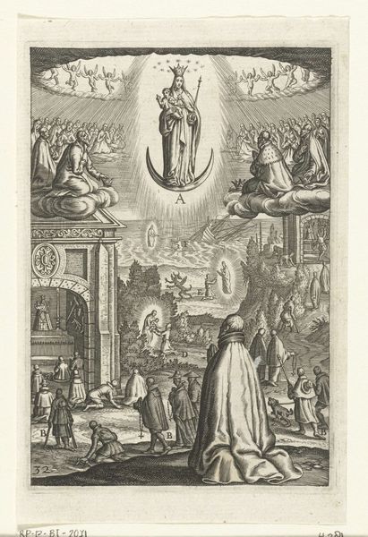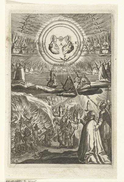 This small emblem, made with etching by an anonymous artist, presents a man at a crossroads, forced to decide whether he will serve God or the Devil. These kinds of didactic images were common in the Netherlands, a region once deeply divided by religious conflict. Looking closely, we see the artist uses established visual codes to create meaning. God and the saints reside in a well-lit, orderly heaven, while below, devils cavort in a chaotic, fiery hell. The man must choose his destiny. But what social conditions shaped the production of this image? The Northern Netherlands endured a long struggle for independence from Spain, fueled in part by religious differences, in the 16th and 17th centuries. Printmaking flourished as a means of spreading ideas and propaganda. This emblem likely reflects the intense religious debates of that era, a visual call to piety in a society wrestling with its spiritual identity. Further research into the history of Dutch printmaking and religious movements of the time would help us understand the full social and institutional context of this compelling image.