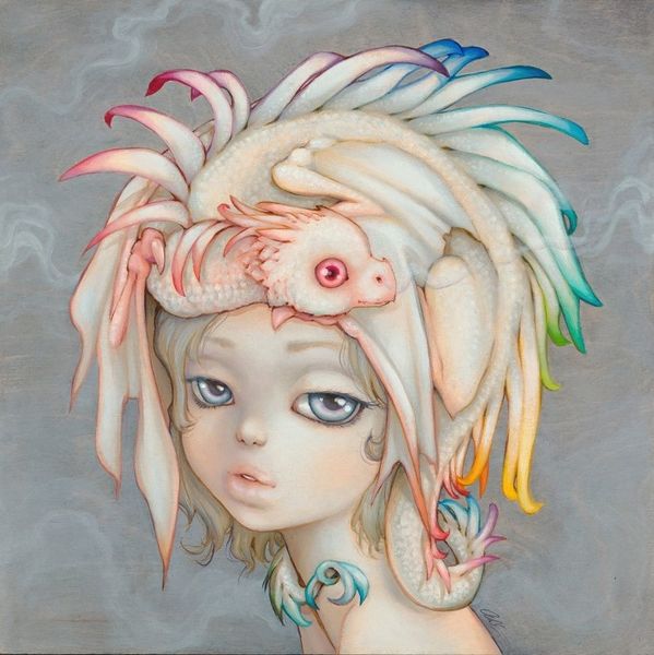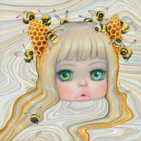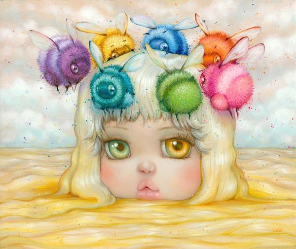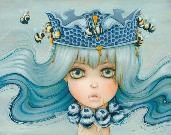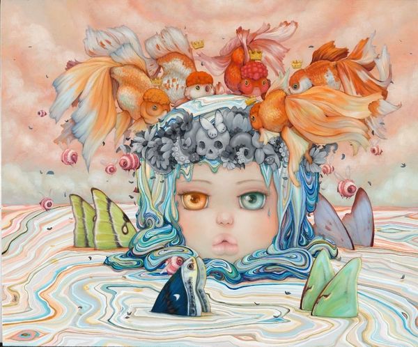 Curator: Camilla d’Errico created this striking work, “Ajna,” in 2017. It appears to be acrylic on canvas. What do you make of it? Editor: My first thought is, 'mesmerizing and unsettling.' That central eye immediately grabs you, doesn’t it? There’s something almost mythological about this figure. Curator: Absolutely. D’Errico is known for blending pop surrealism with manga influences, and here we see her exploring themes of consciousness and perception through symbolism. The third eye, the ‘Ajna’ chakra, represents intuition and insight in Hindu tradition. Editor: Yes, and that's echoed in the heterochromatic eyes, one violet, the other orange. The color variance alone speaks volumes about seeing differently, perhaps about encompassing diverse perspectives. The whole figure emerging from the water, surrounded by floral motifs and insects…it feels rich with layered symbolism. Curator: The monochrome floral wreath is an interesting choice against the more vivid hues of her face and hair, don’t you think? There’s a tension created between those vibrant, hopeful colors and the muted tones of the flowers. This creates a commentary of both life and death that's visually presented for the observer to grasp and reflect upon. Editor: Precisely! Water, of course, often symbolizes the subconscious. It might even suggests the emergence of intuitive insight, the unfolding of a new way of perceiving. And what's most fascinating is the fact that you almost immediately get an intimate sensation just by witnessing the artwork in front of you, giving the impression the child it's reaching the viewer from the "inside out", as a personal journey into spirituality. Curator: The use of this naivistic fantasy style is quite cunning when talking about potentially heavy and spiritual topics such as those discussed. With this image in mind, you can only start wondering how d’Errico's artistic journey allows contemporary audiences to reconsider the nature of imagery within the art market. Editor: It does leave you pondering the relationship between visual language and the exploration of consciousness. It is the case, indeed.