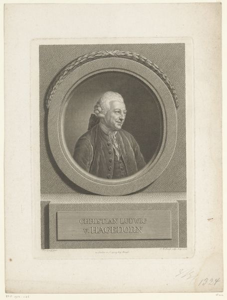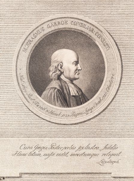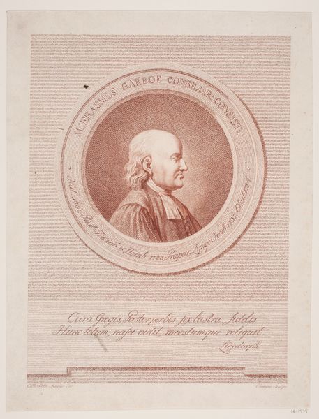 Curator: The print we’re observing here, titled "Rasmus Garboe," was created by J.F. Clemens around 1784-1785. It is currently held at the SMK, the National Gallery of Denmark. Editor: It has an understated dignity. The soft, monochromatic rendering—the subtle variations in that reddish-brown ink—lends a warm, almost antique feeling to the portrayal. Curator: Absolutely. The engraving is fascinating in its semiotic presentation. The subject's profile is framed within a circular cartouche, drawing attention to his countenance. Clemens employs a tight network of etched lines to model the face. It lends a feeling of depth and form. Editor: Speaking of process, one wonders about the engraving. What kind of metal was used for the plate? How many impressions could have been made before the plate started to wear? It gives you a material connection to the era. Curator: Intriguing to consider. Clemens would have carefully controlled the depth of each cut to create contrast. The inscription adds another layer of formality. The controlled composition contributes to the sense of order so valued at that time. Editor: Yes, that’s interesting – the Latin inscription tells us so much about Garboe's legacy and the esteem in which he was held. I imagine these prints were commissioned or at least intended for specific patrons and social networks as a way of cementing Garboe's memory within those communities. Curator: Indeed. Consider also the careful depiction of Garboe's dress. The textures achieved with only linear variations… It really highlights the skill of the engraver in creating form from line alone. Editor: Thinking of line—that hatched pattern surrounding the central image suggests the very labor and technique used to reproduce the image for mass circulation. What would Garboe himself have thought about having his likeness mechanically reproduced in this way? Curator: That introduces the cultural shift as printed imagery became more democratized! A profound point! Editor: I come away admiring the skillful handwork behind it and pondering on how the medium shaped Garboe’s representation and reception at the time. Curator: For me, it's the mastery of technique deployed by Clemens to achieve this illusion of three-dimensionality with only subtle linear interventions.