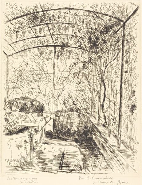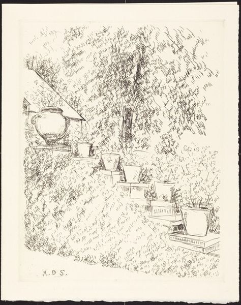 Editor: Here we have André Dunoyer de Segonzac's "L'arrosoir", created between 1929 and 1932 using pen and ink. The linework is so delicate, almost frantic, which gives it an air of casualness, a fleeting moment captured. What historical lens can we apply to viewing this piece? Curator: The period between the wars saw artists wrestling with representation in a world reshaped by conflict and technology. How do we make art in a time of mechanized warfare? Segonzac turns away from overtly political themes, focusing instead on the domestic sphere and the tranquility of nature, rejecting earlier war-focused work, and reflecting a wider societal desire to return to a sense of normalcy. Does the informality strike you as planned or unplanned? Editor: I’d say it feels…deliberately informal. There’s a control of line, despite the seeming chaos. Does this interest in the everyday also say something about the art world itself during this time? Curator: Absolutely. Consider the rise of mass media and photography. Painting and drawing were no longer solely responsible for depicting reality. Artists explored interiority, personal experience, and, like Segonzac, the subjective gaze, often rejecting the grand narratives and formal academic styles of the past. The work being dedicated on the inscription tells us the value of patronage at the time also. Are there other clues within the landscape that lead you to further understanding of society during the late 20's/early 30's? Editor: Hmm…I hadn't noticed the signature. No clues are popping out for me! That's helpful background information. Curator: This work reminds us that even seemingly simple scenes are rooted in a particular time and place. Studying its composition encourages deeper questions about art’s role in reflecting societal shifts and cultural values. Editor: Right, it's about more than just a peaceful patio! Thanks for providing that wider social context.